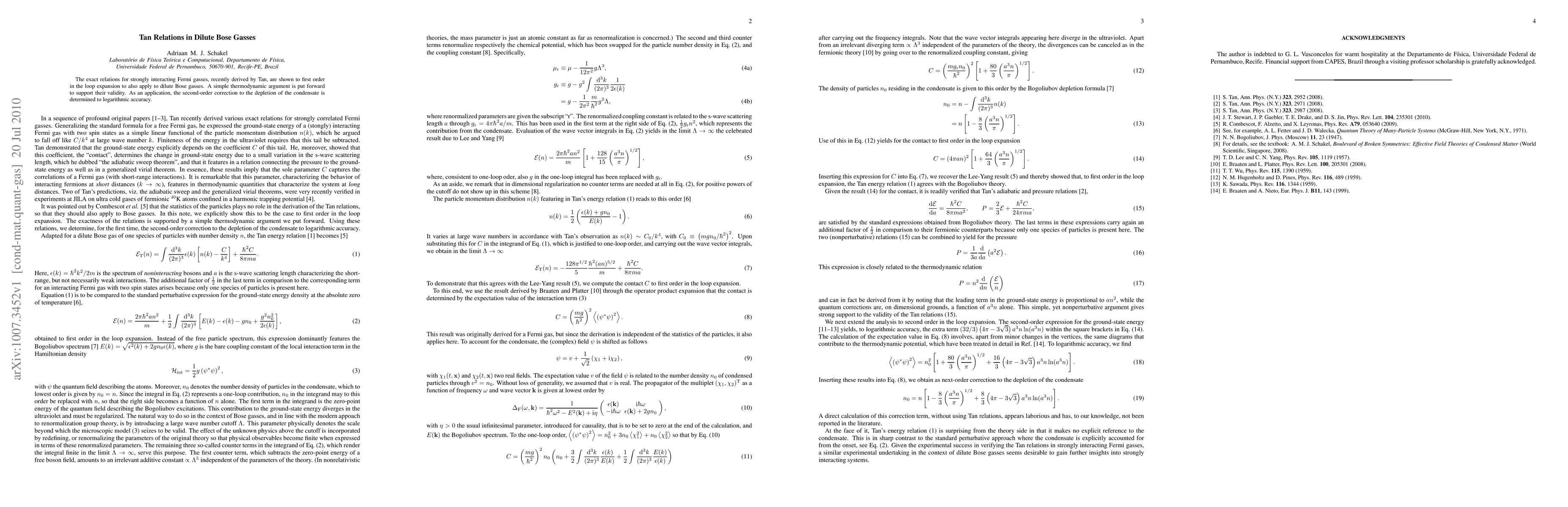 The paper demonstrates that Tan's exact relations for strongly interacting Fermi gases extend to dilute Bose gases, supported by a thermodynamic argument, and applies this to determine the second-order correction to the condensate depletion with logarithmic accuracy.