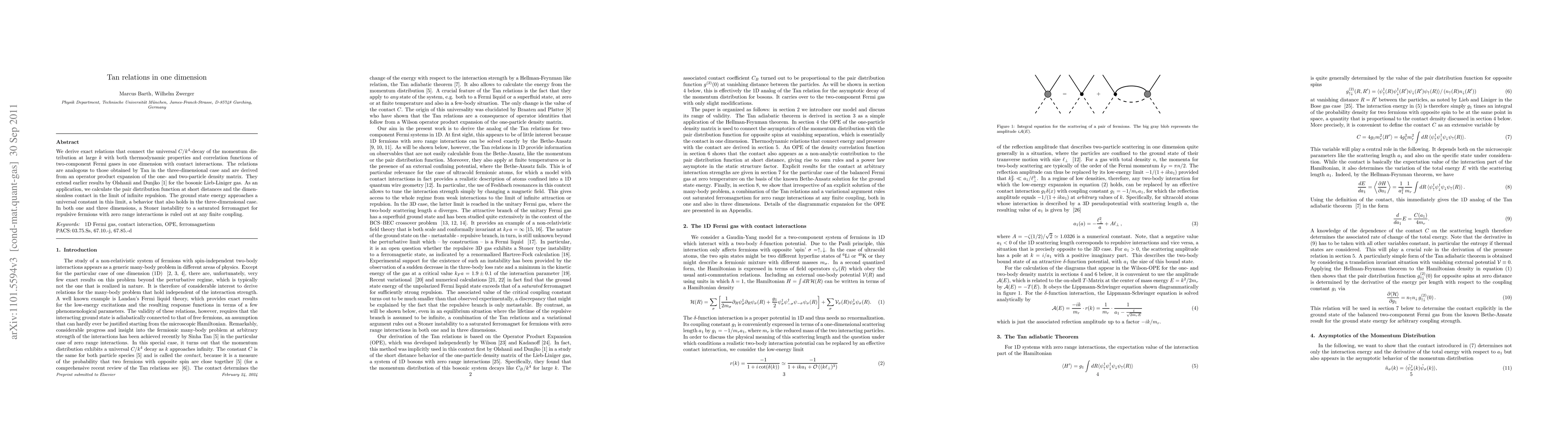 We derive exact relations that connect the universal $C/k^4$-decay of the momentum distribution at large $k$ with both thermodynamic properties and correlation functions of two-component Fermi gases in one dimension with contact interactions. The relations are analogous to those obtained by Tan in the three-dimensional case and are derived from an operator product expansion of the one- and two-particle density matrix. They extend earlier results by Olshanii and Dunjko [Phys. Rev. Lett. 91, 090401 (2003)] for the bosonic Lieb-Liniger gas. As an application, we calculate the pair distribution function at short distances and the dimensionless contact in the limit of infinite repulsion. The ground state energy approaches a universal constant in this limit, a behavior that also holds in the three-dimensional case. In both one and three dimensions, a Stoner instability to a saturated ferromagnet for repulsive fermions with zero range interactions is ruled out at any finite coupling.