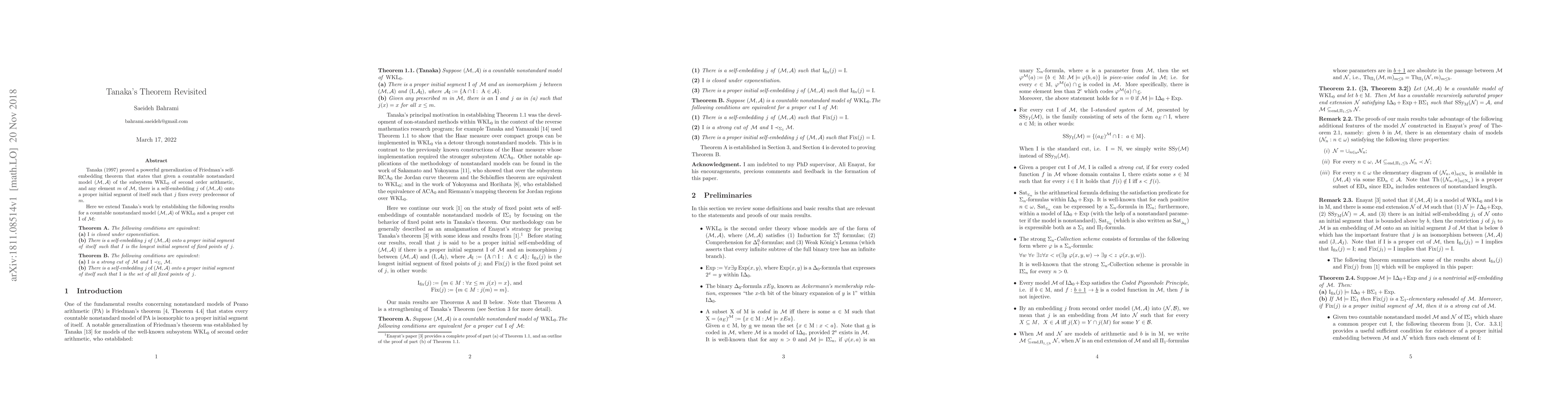 Tanaka (1997) proved a powerful generalization of Friedman's self-embedding theorem that states that given a countable nonstandard model $(\mathcal{M},\mathcal{A})$ of the subsystem $\mathrm{WKL}_{0}$ of second order arithmetic, and any element $m$ of $\mathcal{M}$, there is a self-embedding $j$ of $(\mathcal{M},\mathcal{A})$ onto a proper initial segment of itself such that $j$ fixes every predecessor of $m$. Here we extend Tanaka's work by establishing the following results for a countable nonstandard model $(\mathcal{M},\mathcal{A})$ of $\mathrm{WKL}_{0} $ and a proper cut $\mathrm{I}$ of $\mathcal{M}$: Theorem A. The following conditions are equivalent: (a) $\mathrm{I}$ is closed under exponentiation. (b) There is a self-embedding $j$ of $(\mathcal{M},\mathcal{A})$ onto a proper initial segment of itself such that $I$ is the longest initial segment of fixed points of $j$. Theorem B. The following conditions are equivalent: (a) $\mathrm{I}$ is a strong cut of $\mathcal{M} $ and $\mathrm{I}\prec _{\Sigma _{1}}\mathcal{M}.$ (b) There is a self-embedding $j$ of $(\mathcal{M},\mathcal{A})$ onto a proper initial segment of itself such that $\mathrm{I} $ is the set of all fixed points of $j$.