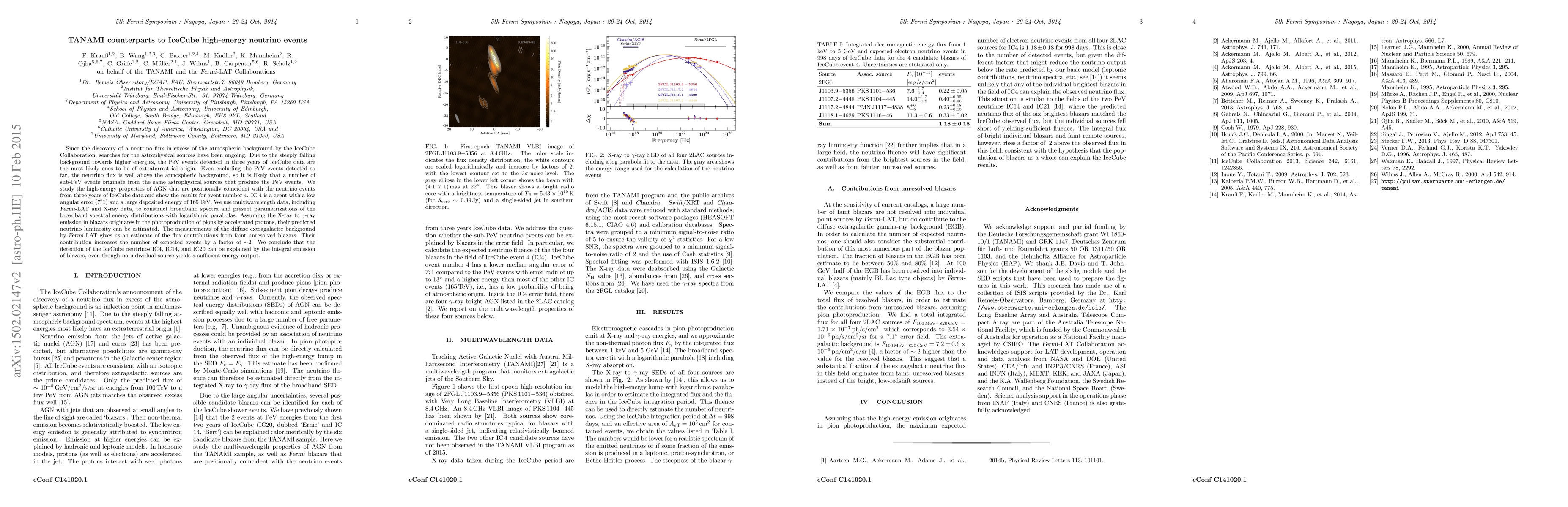 Since the discovery of a neutrino flux in excess of the atmospheric background by the IceCube Collaboration, searches for the astrophysical sources have been ongoing. Due to the steeply falling background towards higher energies, the PeV events detected in three years of IceCube data are the most likely ones to be of extraterrestrial origin. Even excluding the PeV events detected so far, the neutrino flux is well above the atmospheric background, so it is likely that a number of sub-PeV events originate from the same astrophysical sources that produce the PeV events. We study the high-energy properties of AGN that are positionally coincident with the neutrino events from three years of IceCube data and show the results for event number 4. IC 4 is a event with a low angular error (7.1$^\circ$) and a large deposited energy of 165 TeV. We use multiwavelength data, including Fermi/LAT and X-ray data, to construct broadband spectra and present parametrizations of the broadband spectral energy distributions with logarithmic parabolas. Assuming the X-ray to {\gamma}-ray emission in blazars originates in the photoproduction of pions by accelerated protons, their predicted neutrino luminosity can be estimated. The measurements of the diffuse extragalactic background by Fermi/LAT gives us an estimate of the flux contributions from faint unresolved blazars. Their contribution increases the number of expected events by a factor of $\sim$2. We conclude that the detection of the IceCube neutrinos IC4, IC14, and IC20 can be explained by the integral emission of blazars, even though no individual source yields a sufficient energy output.