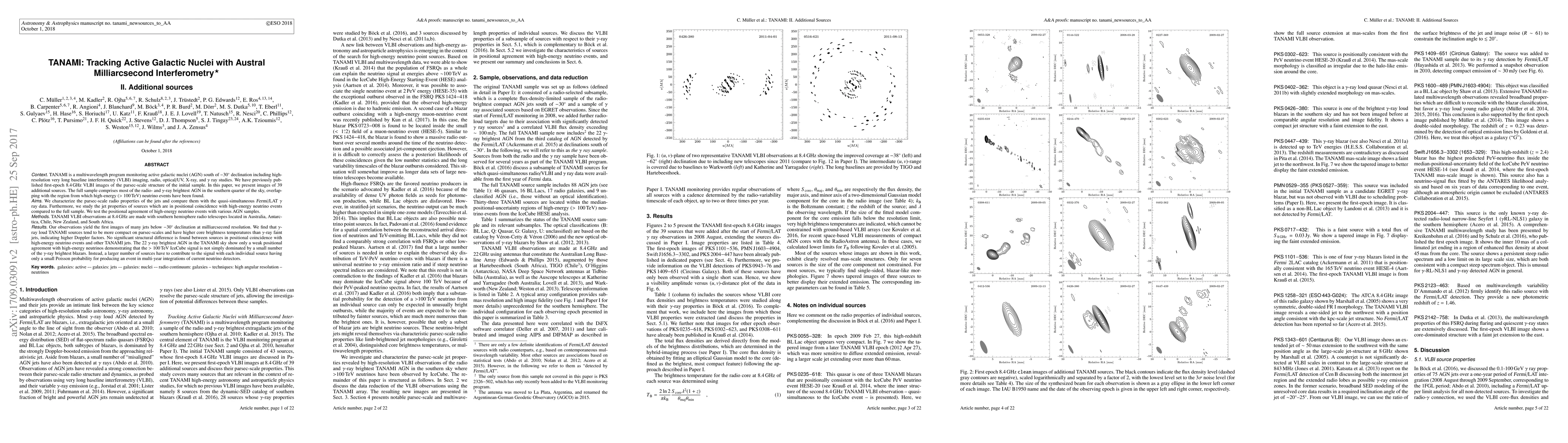 TANAMI is a multiwavelength program monitoring active galactic nuclei (AGN) south of -30deg declination including high-resolution Very Long Baseline Interferometry (VLBI) imaging, radio, optical/UV, X-ray and gamma-ray studies. We have previously published first-epoch 8.4GHz VLBI images of the parsec-scale structure of the initial sample. In this paper, we present images of 39 additional sources. The full sample comprises most of the radio- and gamma-ray brightest AGN in the southern quarter of the sky, overlapping with the region from which high-energy (>100TeV) neutrino events have been found. We characterize the parsec-scale radio properties of the jets and compare with the quasi-simultaneous Fermi/LAT gamma-ray data. Furthermore, we study the jet properties of sources which are in positional coincidence with high-energy neutrino events as compared to the full sample. We test the positional agreement of high-energy neutrino events with various AGN samples. Our observations yield the first images of many jets below -30deg declination at milliarcsecond resolution. We find that gamma-ray loud TANAMI sources tend to be more compact on parsec-scales and have higher core brightness temperatures than gamma-ray faint jets, indicating higher Doppler factors. No significant structural difference is found between sources in positional coincidence with high-energy neutrino events and other TANAMI jets. The 22 gamma-ray brightest AGN in the TANAMI sky show only a weak positional agreement with high-energy neutrinos demonstrating that the >100TeV IceCube signal is not simply dominated by a small number of the $\gamma$-ray brightest blazars. Instead, a larger number of sources have to contribute to the signal with each individual source having only a small Poisson probability for producing an event in multi-year integrations of current neutrino detectors.