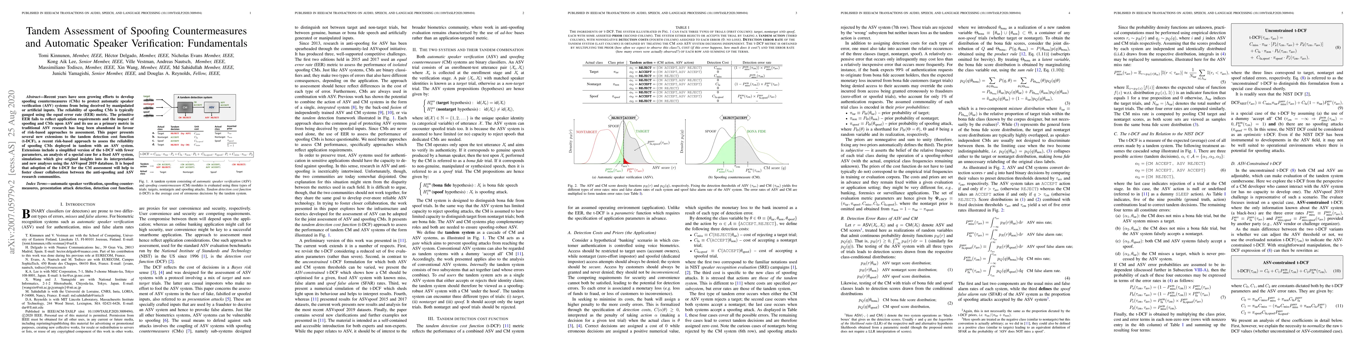 This paper introduces new extensions to the tandem detection cost function (t-DCF) for assessing spoofing countermeasures in automatic speaker verification systems, aiming to replace the traditional equal error rate metric. The proposed t-DCF extensions include a simplified version and analyses using the ASVspoof 2019 database, fostering better collaboration between anti-spoofing and ASV research communities.