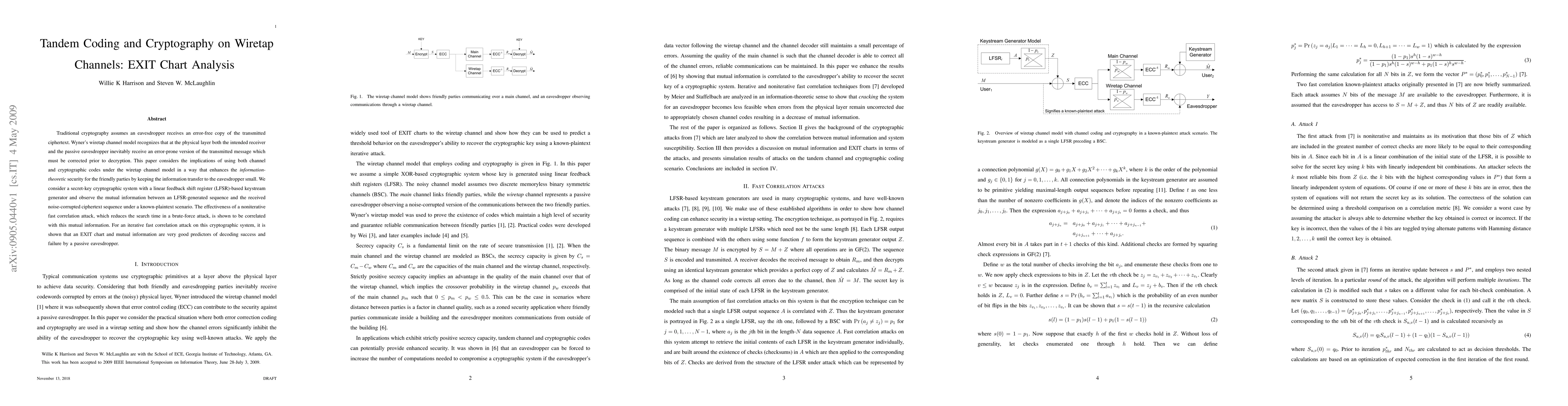 Traditional cryptography assumes an eavesdropper receives an error-free copy of the transmitted ciphertext. Wyner's wiretap channel model recognizes that at the physical layer both the intended receiver and the passive eavesdropper inevitably receive an error-prone version of the transmitted message which must be corrected prior to decryption. This paper considers the implications of using both channel and cryptographic codes under the wiretap channel model in a way that enhances the \emph{information-theoretic} security for the friendly parties by keeping the information transfer to the eavesdropper small. We consider a secret-key cryptographic system with a linear feedback shift register (LFSR)-based keystream generator and observe the mutual information between an LFSR-generated sequence and the received noise-corrupted ciphertext sequence under a known-plaintext scenario. The effectiveness of a noniterative fast correlation attack, which reduces the search time in a brute-force attack, is shown to be correlated with this mutual information. For an iterative fast correlation attack on this cryptographic system, it is shown that an EXIT chart and mutual information are very good predictors of decoding success and failure by a passive eavesdropper.