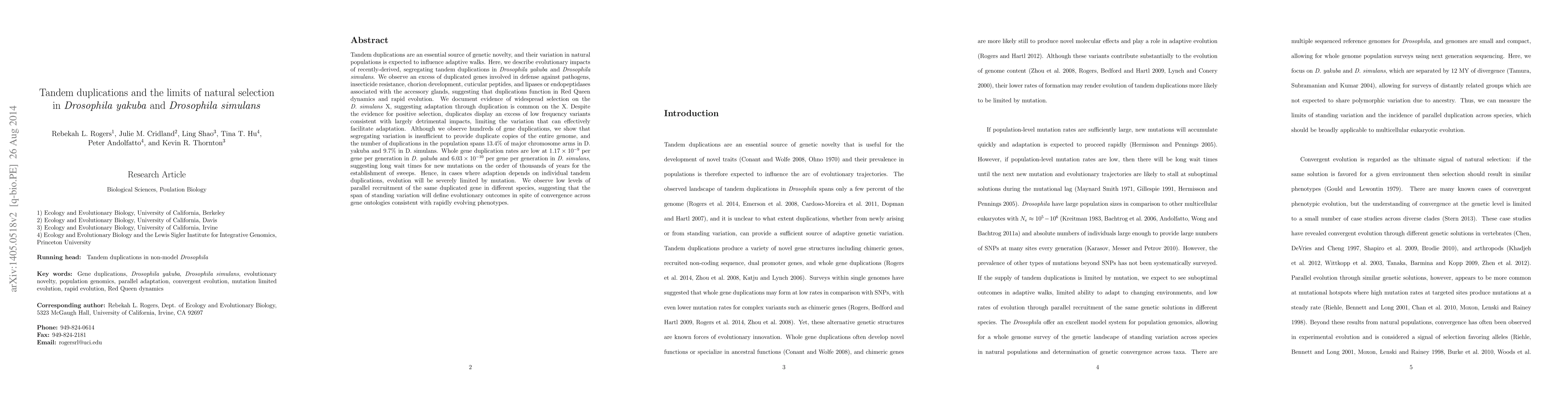 This study investigates tandem duplications in Drosophila yakuba and Drosophila simulans, revealing that while duplications are crucial for genetic novelty and rapid evolution, they are limited by low mutation rates and selection pressures. The research highlights the prevalence of duplicated genes involved in defense and adaptation, yet finds that low frequency variants often indicate detrimental impacts, constraining effective adaptation.