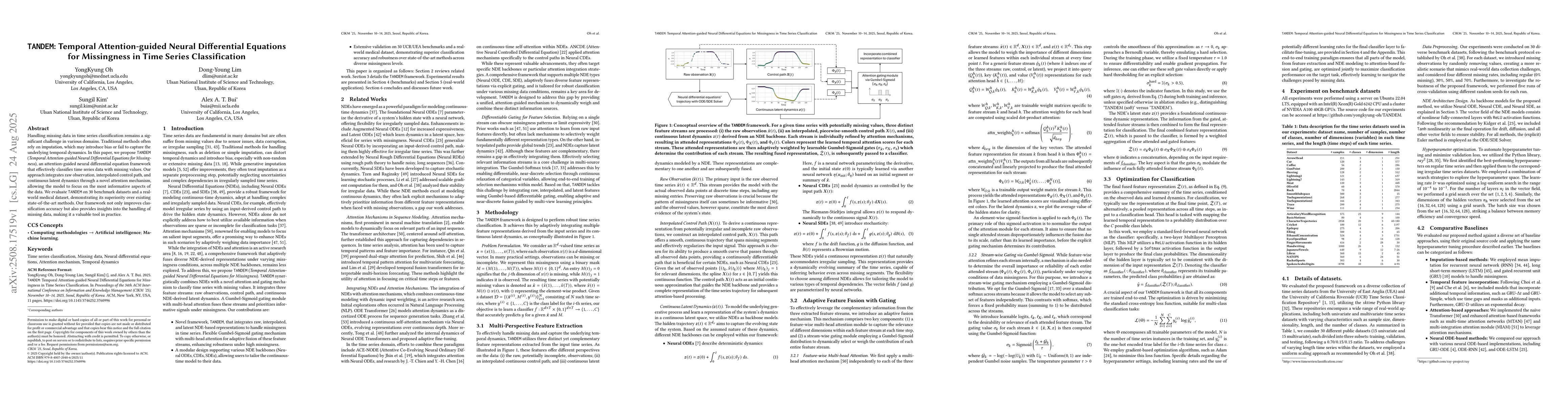 Handling missing data in time series classification remains a significant challenge in various domains. Traditional methods often rely on imputation, which may introduce bias or fail to capture the underlying temporal dynamics. In this paper, we propose TANDEM (Temporal Attention-guided Neural Differential Equations for Missingness), an attention-guided neural differential equation framework that effectively classifies time series data with missing values. Our approach integrates raw observation, interpolated control path, and continuous latent dynamics through a novel attention mechanism, allowing the model to focus on the most informative aspects of the data. We evaluate TANDEM on 30 benchmark datasets and a real-world medical dataset, demonstrating its superiority over existing state-of-the-art methods. Our framework not only improves classification accuracy but also provides insights into the handling of missing data, making it a valuable tool in practice.