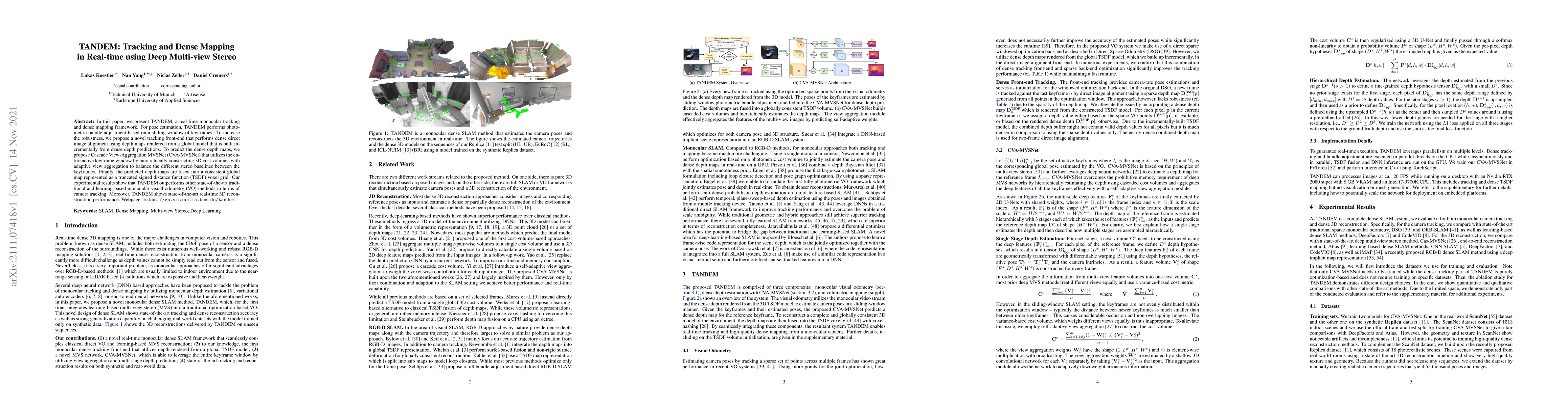 TANDEM is a real-time monocular tracking and dense mapping framework that uses photometric bundle adjustment and a novel tracking front-end for robust pose estimation. It employs Cascade View-Aggregation MVSNet for dense depth map prediction and integrates these into a TSDF voxel grid for 3D reconstruction, outperforming other monocular VO methods.