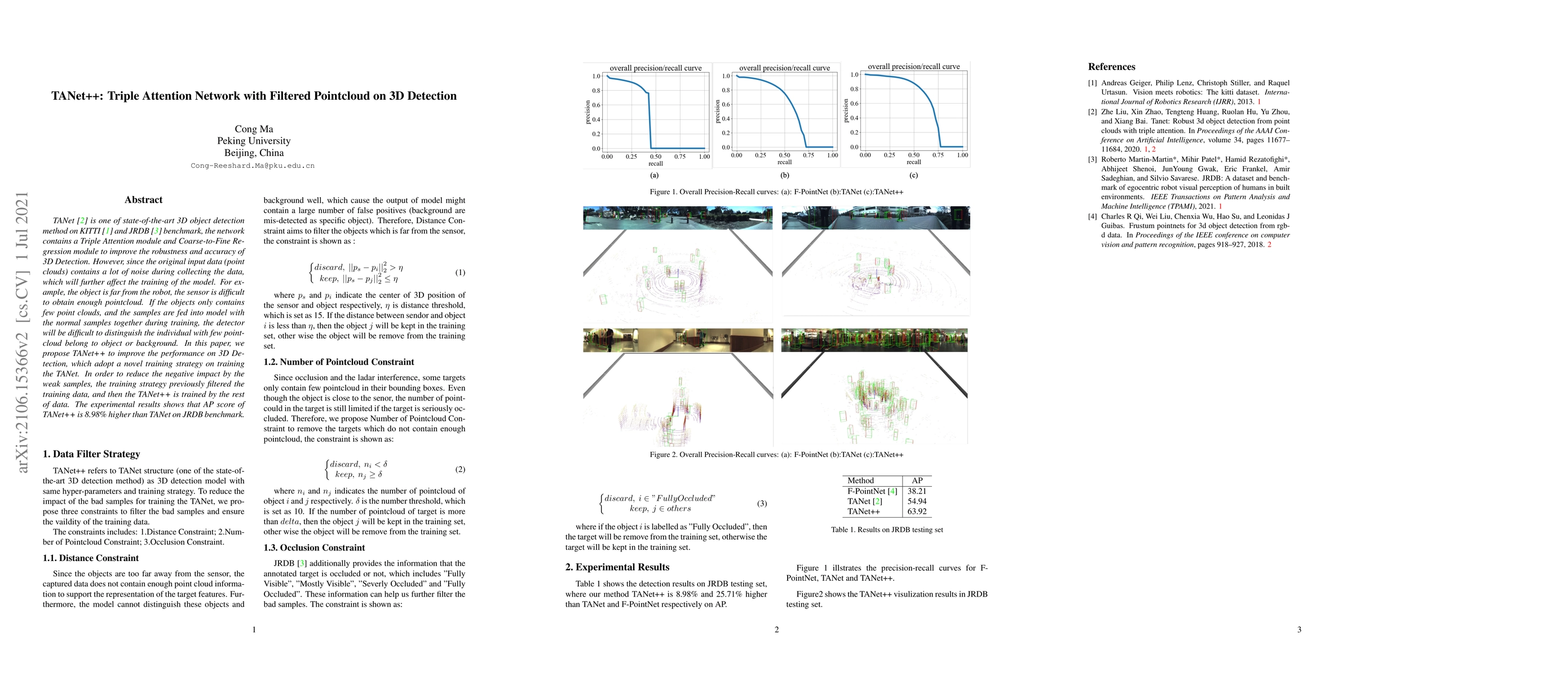 TANet is one of state-of-the-art 3D object detection method on KITTI and JRDB benchmark, the network contains a Triple Attention module and Coarse-to-Fine Regression module to improve the robustness and accuracy of 3D Detection. However, since the original input data (point clouds) contains a lot of noise during collecting the data, which will further affect the training of the model. For example, the object is far from the robot, the sensor is difficult to obtain enough pointcloud. If the objects only contains few point clouds, and the samples are fed into model with the normal samples together during training, the detector will be difficult to distinguish the individual with few pointcloud belong to object or background. In this paper, we propose TANet++ to improve the performance on 3D Detection, which adopt a novel training strategy on training the TANet. In order to reduce the negative impact by the weak samples, the training strategy previously filtered the training data, and then the TANet++ is trained by the rest of data. The experimental results shows that AP score of TANet++ is 8.98 higher than TANet on JRDB benchmark.