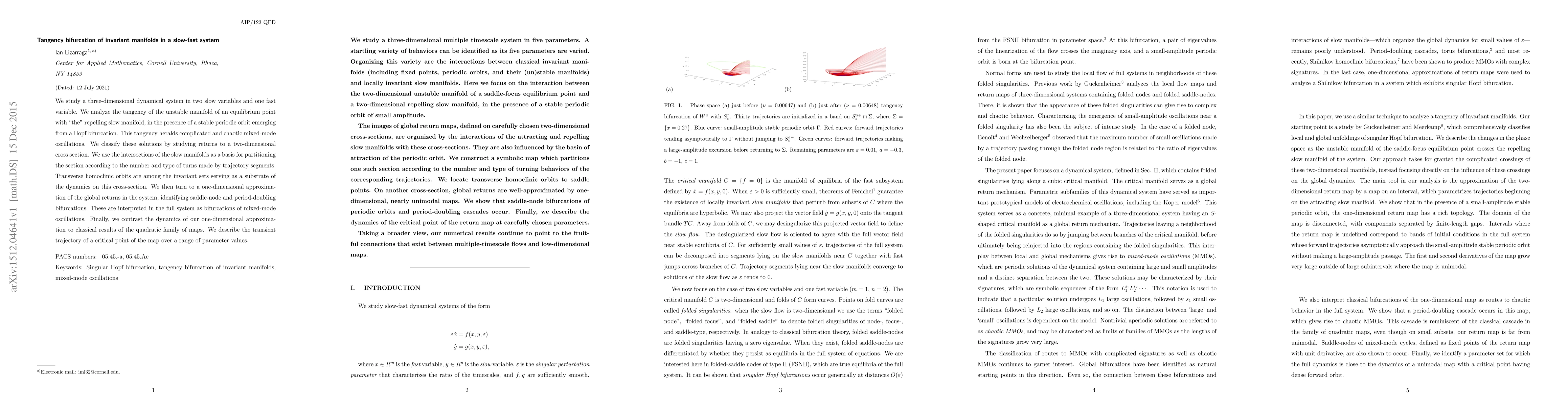 We study a three-dimensional dynamical system in two slow variables and one fast variable. We analyze the tangency of the unstable manifold of an equilibrium point with "the" repelling slow manifold, in the presence of a stable periodic orbit emerging from a Hopf bifurcation. This tangency heralds complicated and chaotic mixed-mode oscillations. We classify these solutions by studying returns to a two-dimensional cross section. We use the intersections of the slow manifolds as a basis for partitioning the section according to the number and type of turns made by trajectory segments. Transverse homoclinic orbits are among the invariant sets serving as a substrate of the dynamics on this cross-section. We then turn to a one-dimensional approximation of the global returns in the system, identifying saddle-node and period-doubling bifurcations. These are interpreted in the full system as bifurcations of mixed-mode oscillations. Finally, we contrast the dynamics of our one-dimensional approximation to classical results of the quadratic family of maps. We describe the transient trajectory of a critical point of the map over a range of parameter values.