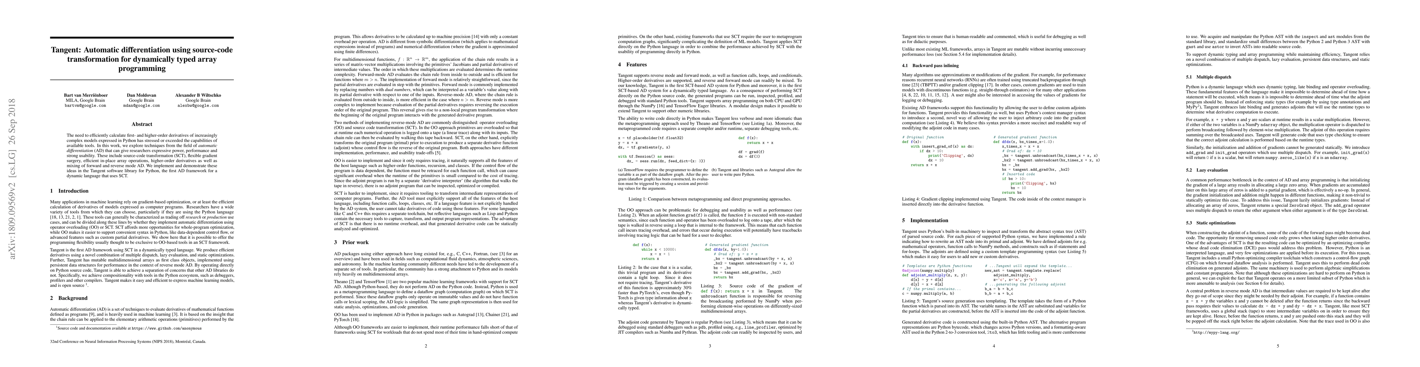 The paper introduces Tangent, a novel automatic differentiation library for Python that leverages source-code transformation to efficiently compute derivatives for dynamically typed array programming. It combines techniques like gradient surgery, in-place operations, and mixed mode AD to offer performance and usability for complex models.