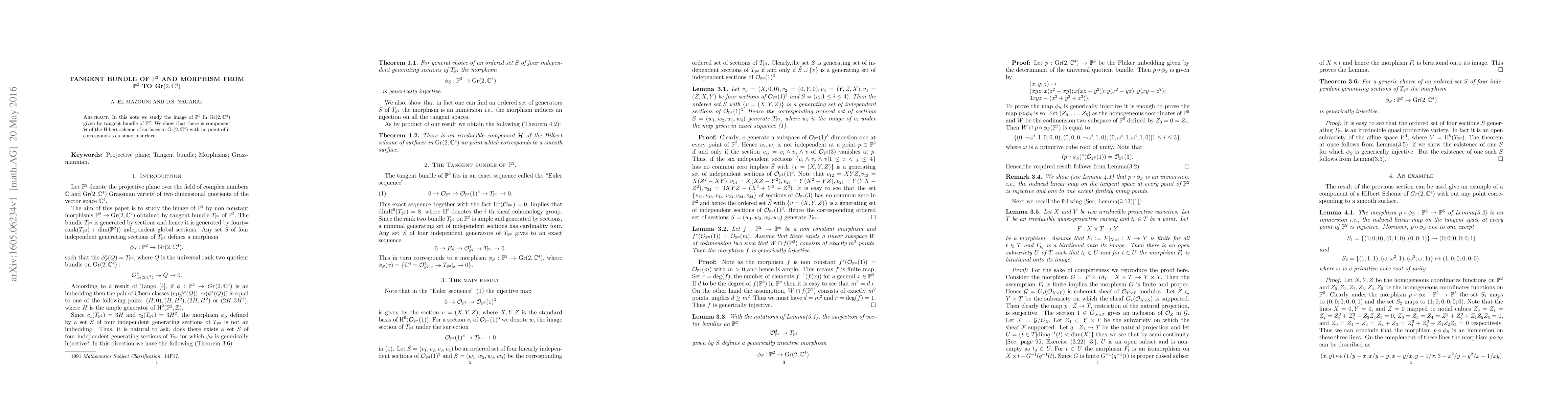This paper investigates the image of $\PP^2$ in $\text{Gr}(2, \CC^{4})$ via its tangent bundle, revealing a component $\mathcal{H}$ in the Hilbert scheme of surfaces that contains no smooth surfaces.