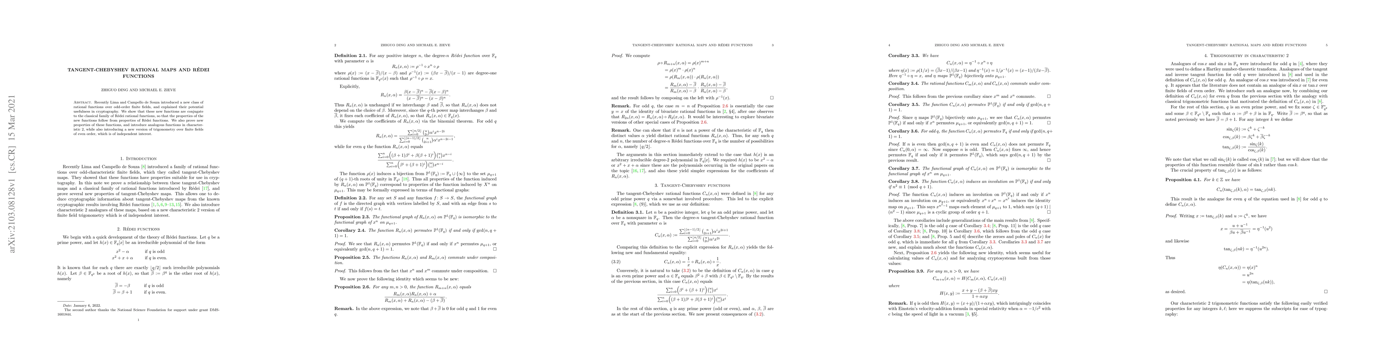 Recently Lima and Campello de Souza introduced a new class of rational functions over odd-order finite fields, and explained their potential usefulness in cryptography. We show that these new functions are conjugate to the classical family of Redei rational functions, so that the properties of the new functions follow from properties of Redei functions. We also prove new properties of these functions, and introduce analogous functions in characteristic 2, while also introducing a new version of trigonometry over finite fields of even order, which is of independent interest.