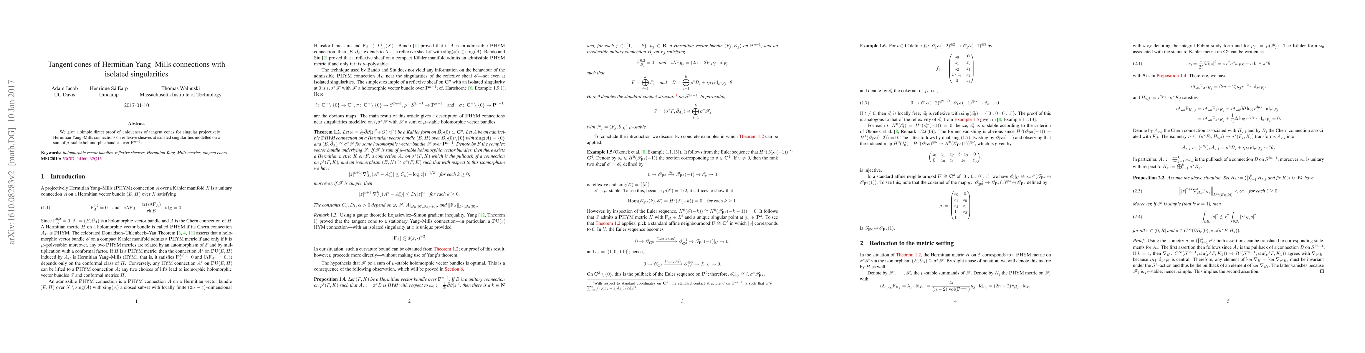 We give a simple direct proof of uniqueness of tangent cones for singular projectively Hermitian Yang-Mills connections on reflexive sheaves at isolated singularities modelled on $\mu$-polystable holomorphic bundles over $\mathbf{P}^{n-1}$.