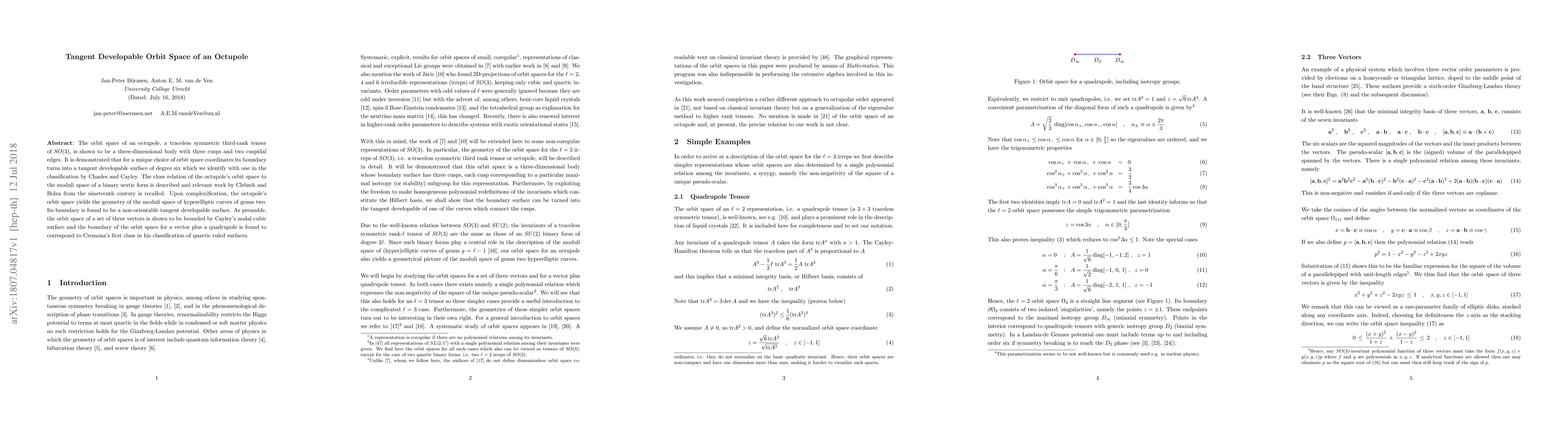 This paper explores the orbit space of an octupole, revealing it as a three-dimensional body with cusps and edges, and demonstrates its boundary forms a tangent developable surface of degree six. The study also connects the octupole's orbit space to the moduli space of binary sextic forms and hyperelliptic curves of genus two.