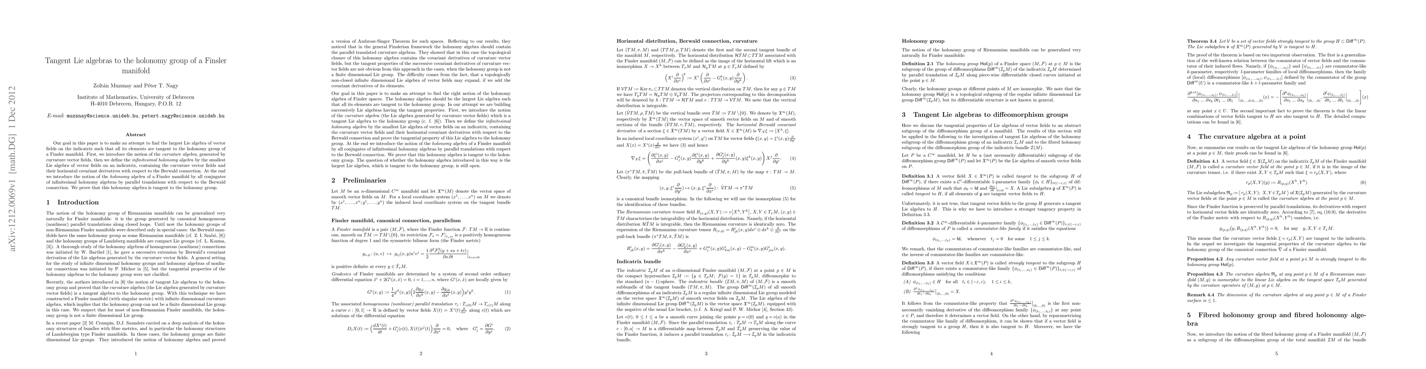 This paper investigates the largest Lie algebra of vector fields on the indicatrix that are tangent to the holonomy group of a Finsler manifold. It introduces the curvature algebra and the infinitesimal holonomy algebra, leading to the definition of the holonomy algebra, which is shown to be tangent to the holonomy group.