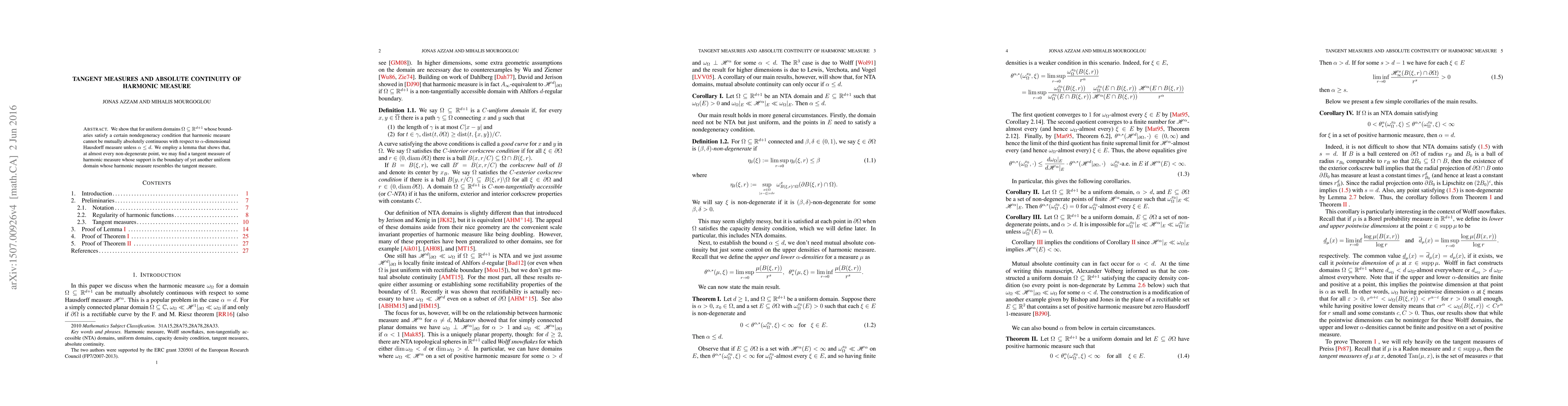 We show that for uniform domains $\Omega\subseteq \mathbb{R}^{d+1}$ whose boundaries satisfy a certain nondegeneracy condition that harmonic measure cannot be mutually absolutely continuous with respect to $\alpha$-dimensional Hausdorff measure unless $\alpha\leq d$. We employ a lemma that shows that at almost every nondegenerate point, we may find a tangent measure of harmonic measure whose support is the boundary of yet another uniform domain whose harmonic measure resembles the tangent measure.