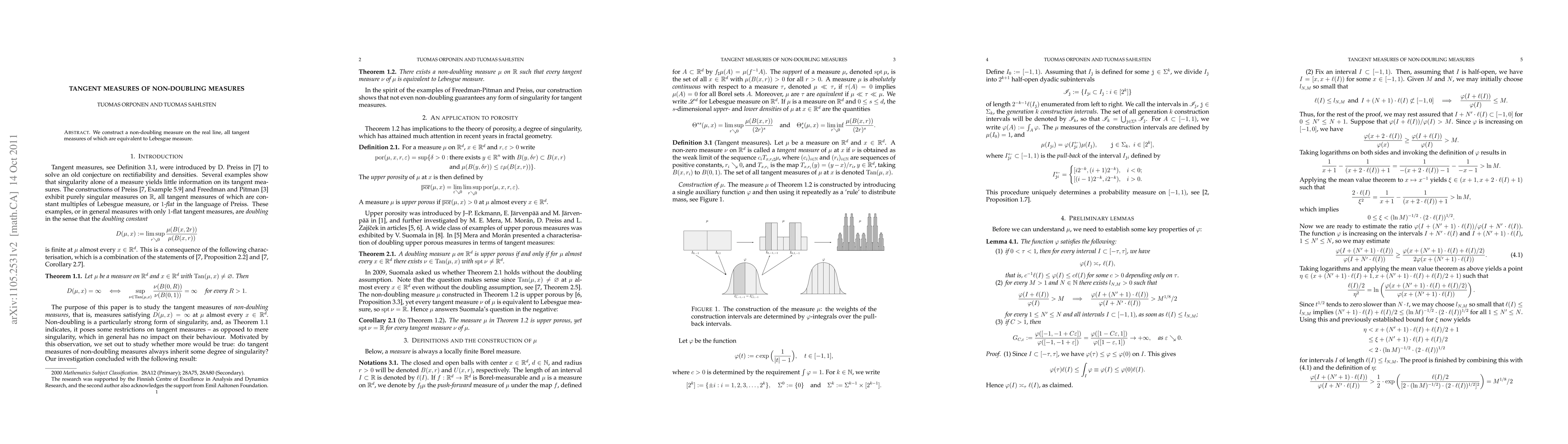 Summary: The paper constructs a non-doubling measure on the real line where all tangent measures are equivalent to the Lebesgue measure, illustrating a unique property of this measure.