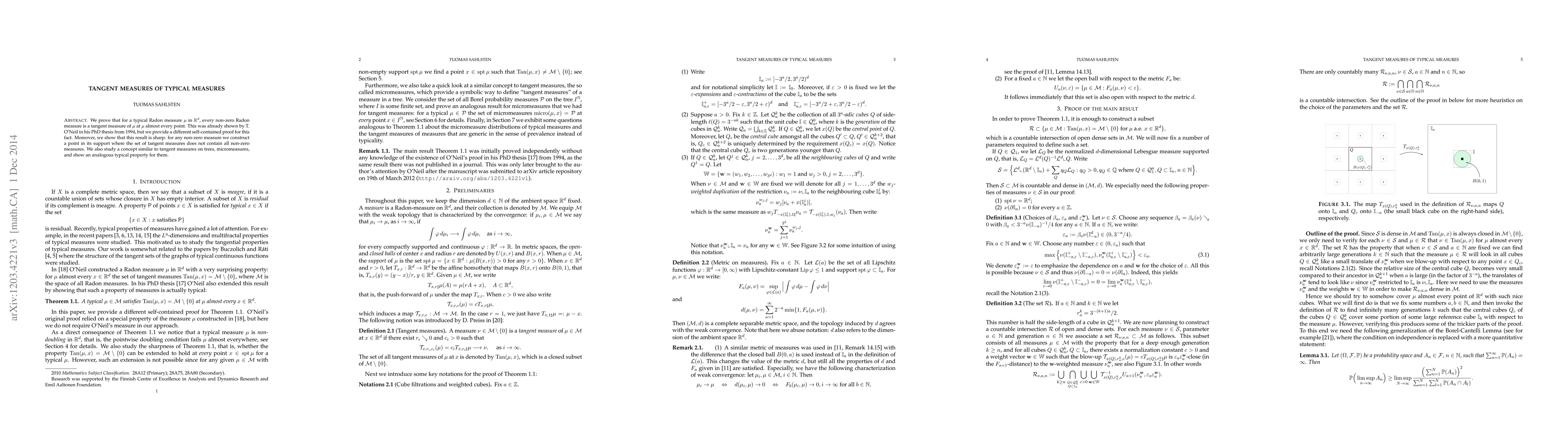 This paper proves that for a typical Radon measure in \( \mathbb{R}^d \), every non-zero Radon measure is a tangent measure almost everywhere, providing a new self-contained proof. It also demonstrates that this result is sharp and explores analogous properties for micromeasures on trees.
