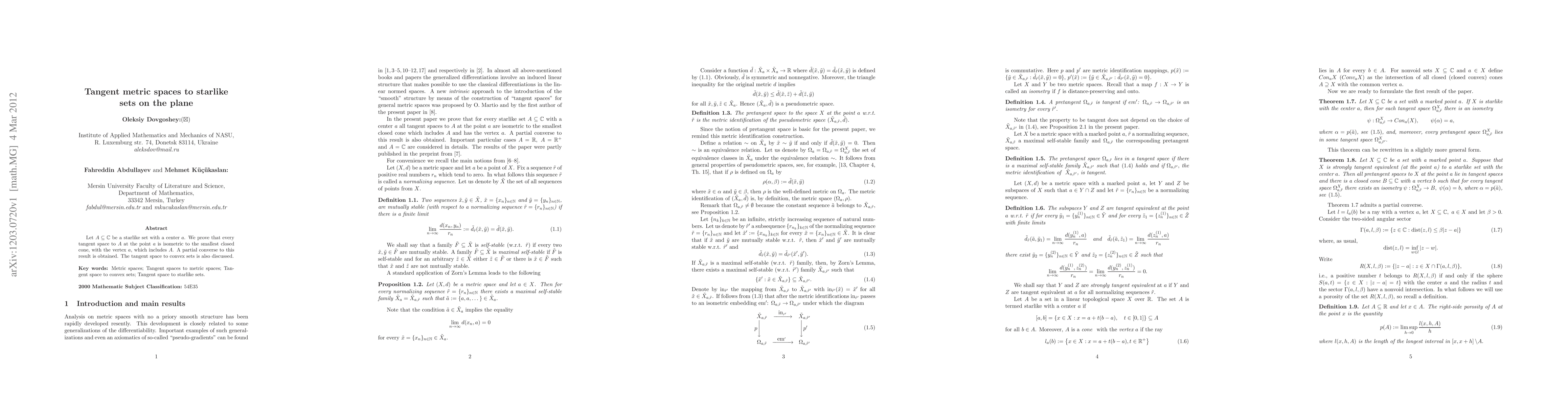 Let $A\subseteq\mathbb C$ be a starlike set with a center $a$. We prove that every tangent space to $A$ at the point $a$ is isometric to the smallest closed cone, with the vertex $a$, which includes $A$. A partial converse to this result is obtained. The tangent space to convex sets is also discussed.