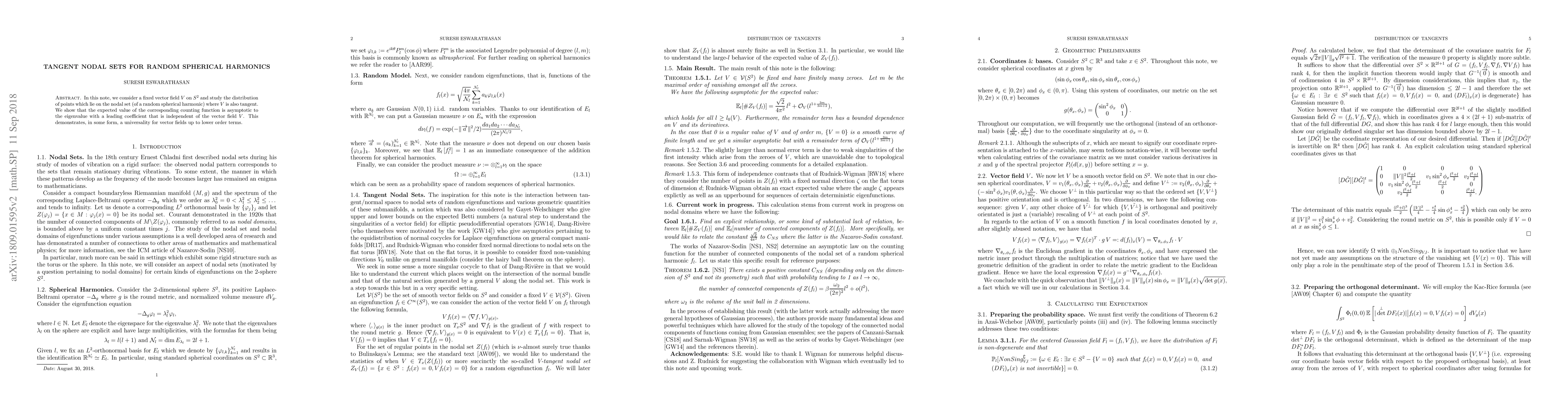 This paper investigates the distribution of tangent nodal sets of random spherical harmonics relative to a fixed vector field on $S^2$, showing that the expected count of such points is asymptotically proportional to the eigenvalue, revealing a form of universality for vector fields.
