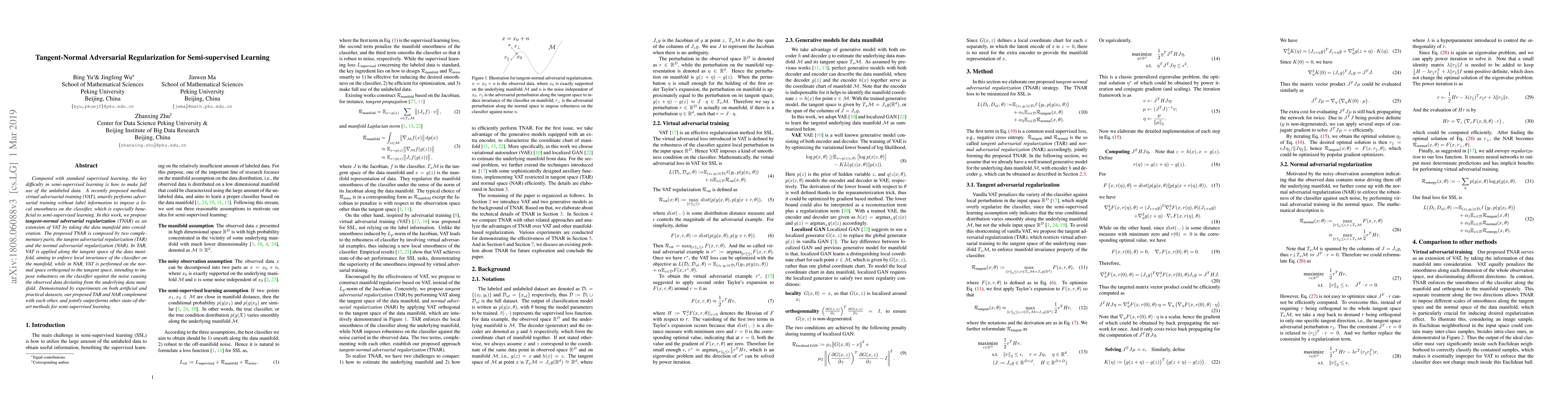 This paper proposes tangent-normal adversarial regularization (TNAR) for semi-supervised learning, extending virtual adversarial training (VAT) to consider the data manifold. TNAR consists of tangent adversarial regularization (TAR) and normal adversarial regularization (NAR), which respectively enforce local invariance and robustness against noise, and outperforms other methods in experiments.