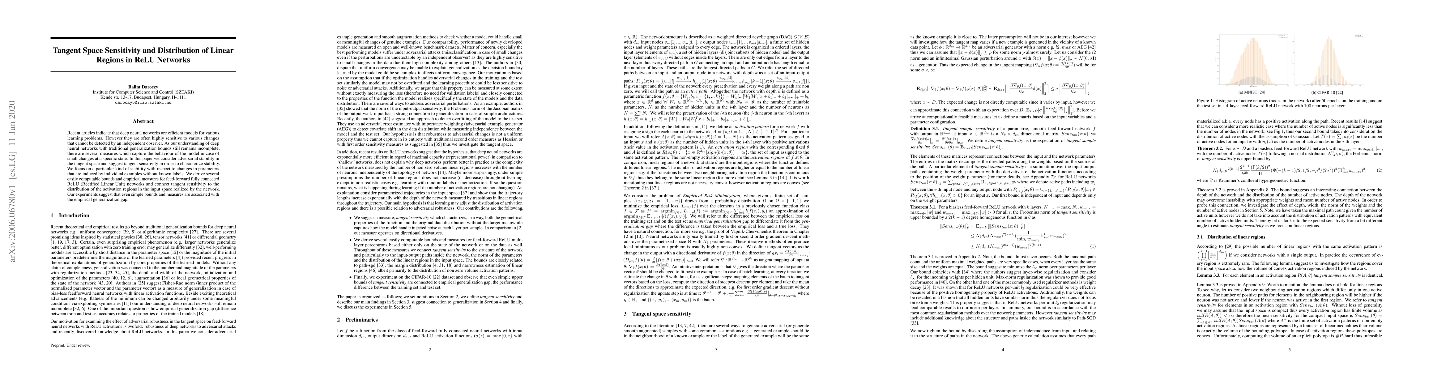 Recent articles indicate that deep neural networks are efficient models for various learning problems. However they are often highly sensitive to various changes that cannot be detected by an independent observer. As our understanding of deep neural networks with traditional generalization bounds still remains incomplete, there are several measures which capture the behaviour of the model in case of small changes at a specific state. In this paper we consider adversarial stability in the tangent space and suggest tangent sensitivity in order to characterize stability. We focus on a particular kind of stability with respect to changes in parameters that are induced by individual examples without known labels. We derive several easily computable bounds and empirical measures for feed-forward fully connected ReLU (Rectified Linear Unit) networks and connect tangent sensitivity to the distribution of the activation regions in the input space realized by the network. Our experiments suggest that even simple bounds and measures are associated with the empirical generalization gap.