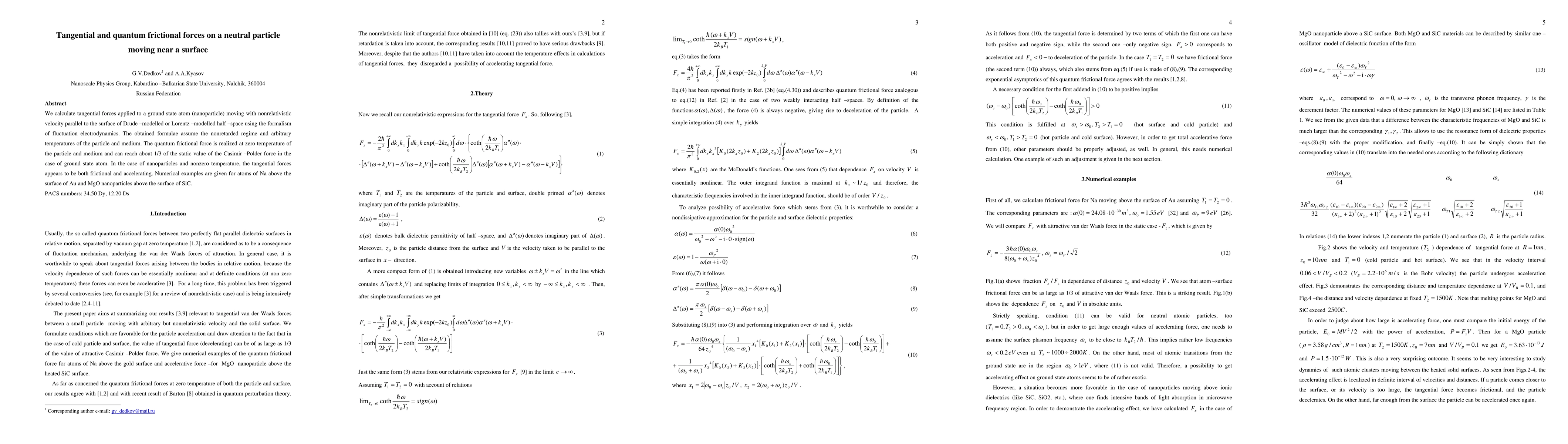 We calculate tangential forces applied to a ground state atom (nanoparticle) moving with nonrelativistic velocity parallel to the surface of Drude -modelled or Lorentz -modelled half -space using the formalism of fluctuation electrodynamics.The obtained formulae assume the nonretarded regime and arbitrary temperatures of the particle and medium. The quantum frictional force is realized at zero temperature of the particle and medium and can reach about 1/3 of the static value of the Casimir -Polder force in the case of ground state atom. In the case of nanoparticles and nonzero temperature, the tangential forces appears to be both frictional and accelerating. Numerical examples are given for atoms of Na above the surface of Au and MgO nanoparticles above the surface of SiC.