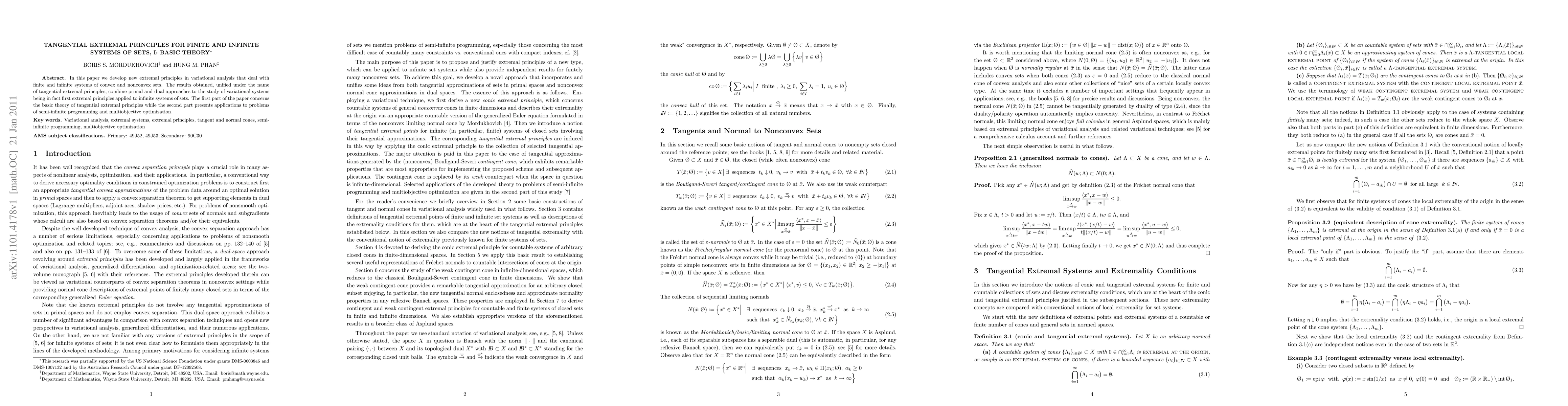 In this paper we develop new extremal principles in variational analysis that deal with finite and infinite systems of convex and nonconvex sets. The results obtained, unified under the name of tangential extremal principles, combine primal and dual approaches to the study of variational systems being in fact first extremal principles applied to infinite systems of sets. The first part of the paper concerns the basic theory of tangential extremal principles while the second part presents applications to problems of semi-infinite programming and multiobjective optimization.