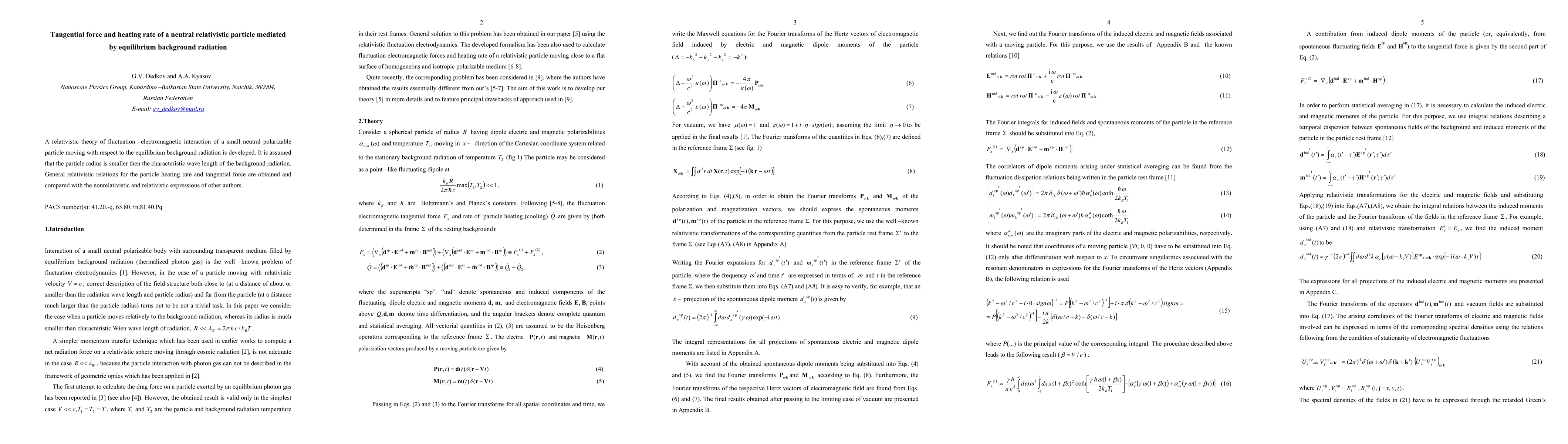 A relativistic theory of fluctuation -electromagnetic interaction of a small polarizable particle moving with respect to the equilibrium background radiation is reviewed. It is assumed that the particle radius is smaller then characteristic wave length of the background radiation. General relativistic relations for the particle heating rate and tangential force are obtained and compared with nonrelativistic and relativistic expressions of other authors.
