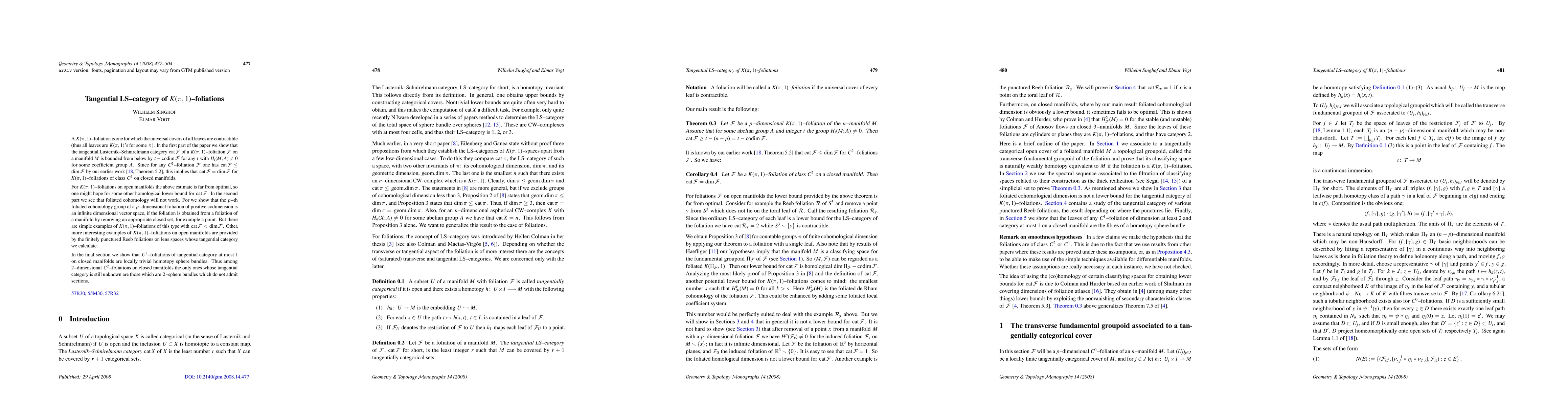 The paper establishes a lower bound for the tangential Lusternik-Schnirelmann category of C^2 K(pi,1)-foliations on closed manifolds, showing it equals the dimension of the foliation. For open manifolds, it demonstrates that foliated cohomology cannot provide a homological lower bound and explores examples of K(pi,1)-foliations on lens spaces. It concludes by proving that C^1-foliations with tangential category at most 1 on closed manifolds are locally trivial homotopy sphere bundles.
