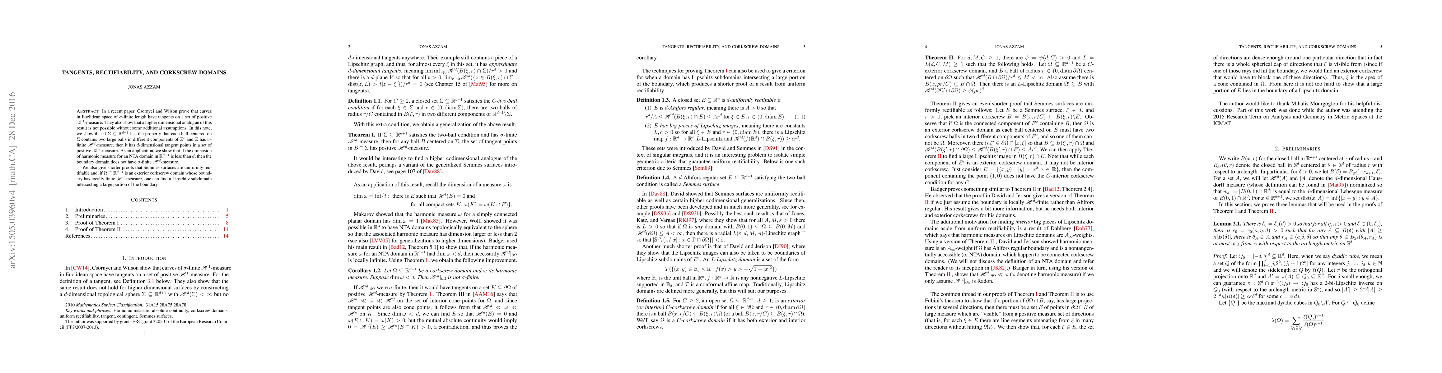 In a recent paper, Cs\"ornyei and Wilson prove that curves in Euclidean space of $\sigma$-finite length have tangents on a set of positive $\mathscr{H}^{1}$-measure. They also show that a higher dimensional analogue of this result is not possible without some additional assumptions. In this note, we show that if $\Sigma\subseteq \mathbb{R}^{d+1}$ has the property that each ball centered on $\Sigma$ contains two large balls in different components of $\Sigma^{c}$ and $\Sigma$ has $\sigma$-finite $\mathscr{H}^{d}$-measure, then it has $d$-dimensional tangent points in a set of positive $\mathscr{H}^{d}$-measure. We also give shorter proofs that Semmes surfaces are uniformly rectifiable and, if $\Omega\subseteq \mathbb{R}^{d+1}$ is an exterior corkscrew domain whose boundary has locally finite $\mathscr{H}^{d}$-measure, one can find a Lipschitz subdomain intersecting a large portion of the boundary.