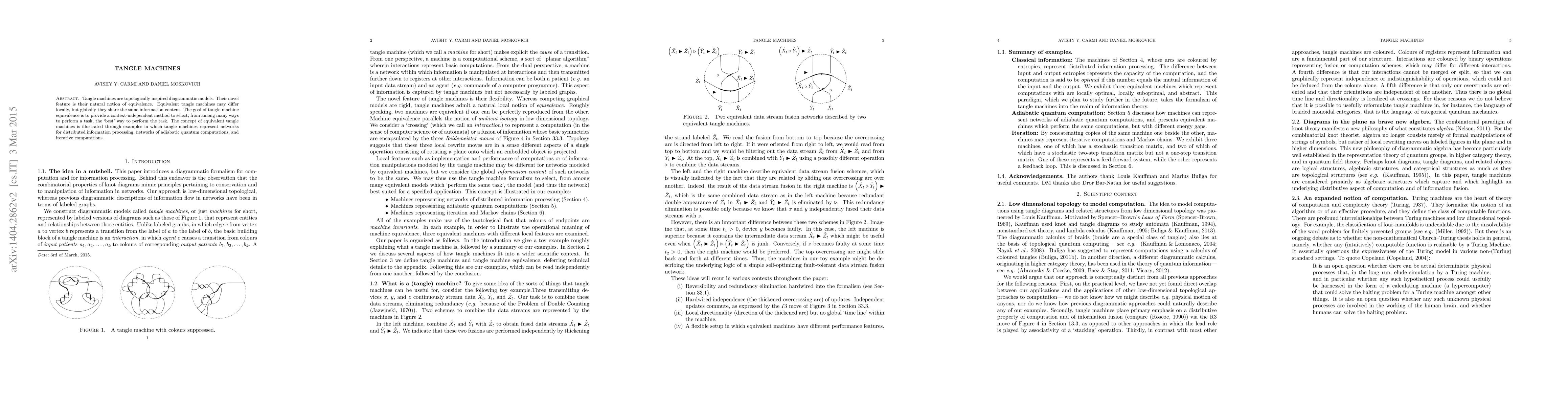 Tangle machines are topologically inspired diagrammatic models. Their novel feature is their natural notion of equivalence. Equivalent tangle machines may differ locally, but globally they are considered to share the same information content. The goal of tangle machine equivalence is to provide a context-independent method to select, from among many ways to perform a task, the `best' way to perform the task. The concept of equivalent tangle machines is illustrated through examples in which they represent recursive computations, networks of adiabatic quantum computations, and networks of distributed information processing.
