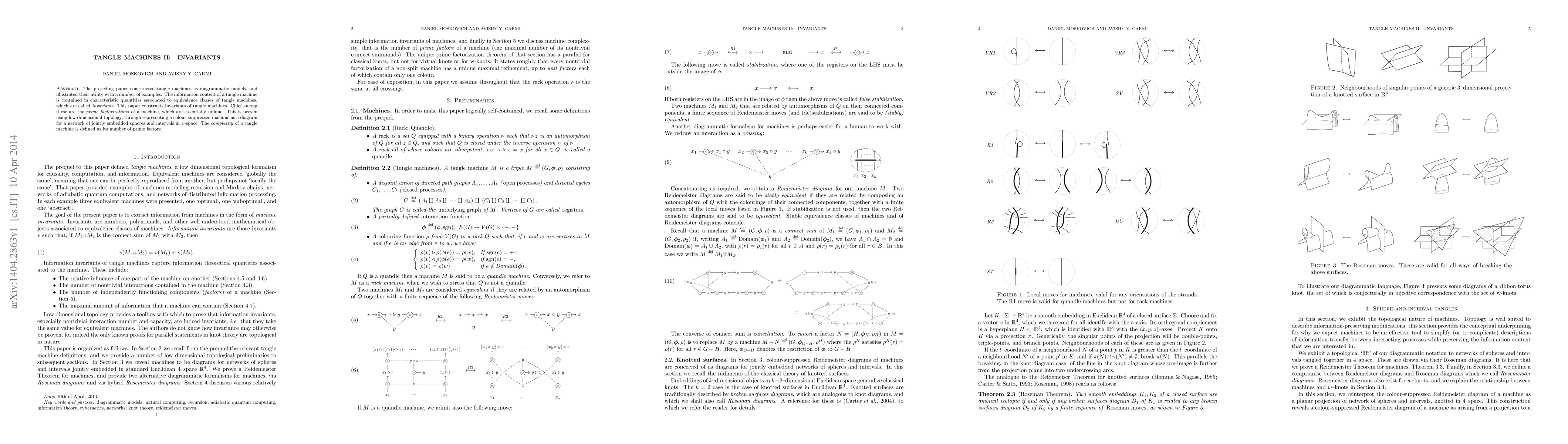 The preceding paper constructed tangle machines as diagrammatic models, and illustrated their utility with a number of examples. The information content of a tangle machine is contained in characteristic quantities associated to equivalence classes of tangle machines, which are called invariants. This paper constructs invariants of tangle machines. Chief among these are the prime factorizations of a machine, which are essentially unique. This is proven using low dimensional topology, through representing a colour-suppressed machine as a diagram for a network of jointly embedded spheres and intervals in 4-space. The complexity of a tangle machine is defined as its number of prime factors.