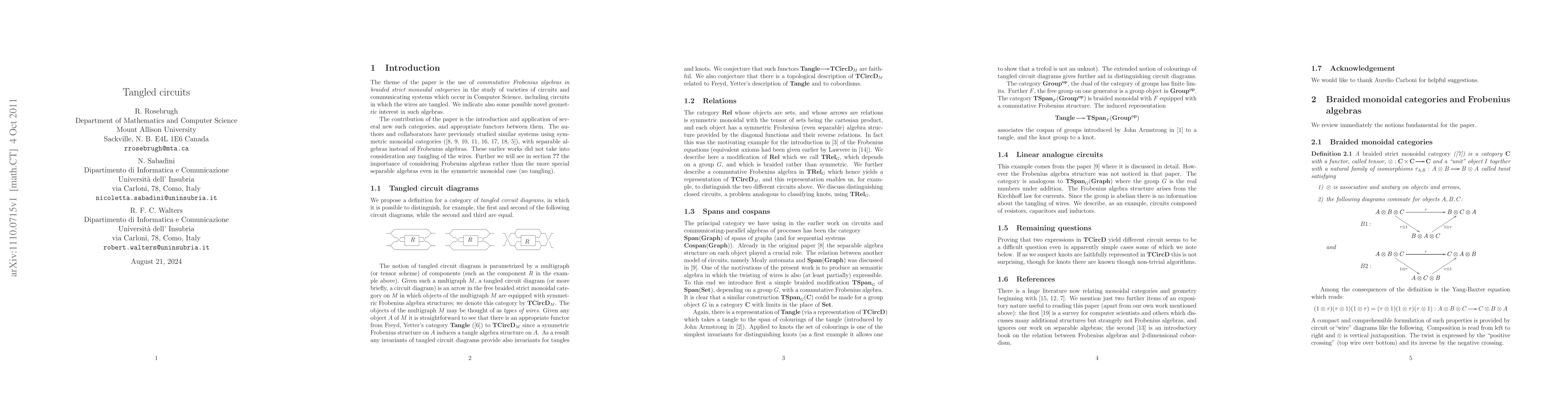 The theme of the paper is the use of commutative Frobenius algebras in braided strict monoidal categories in the study of varieties of circuits and communicating systems which occur in Computer Science, including circuits in which the wires are tangled. We indicate also some possible novel geometric interest in such algebras.