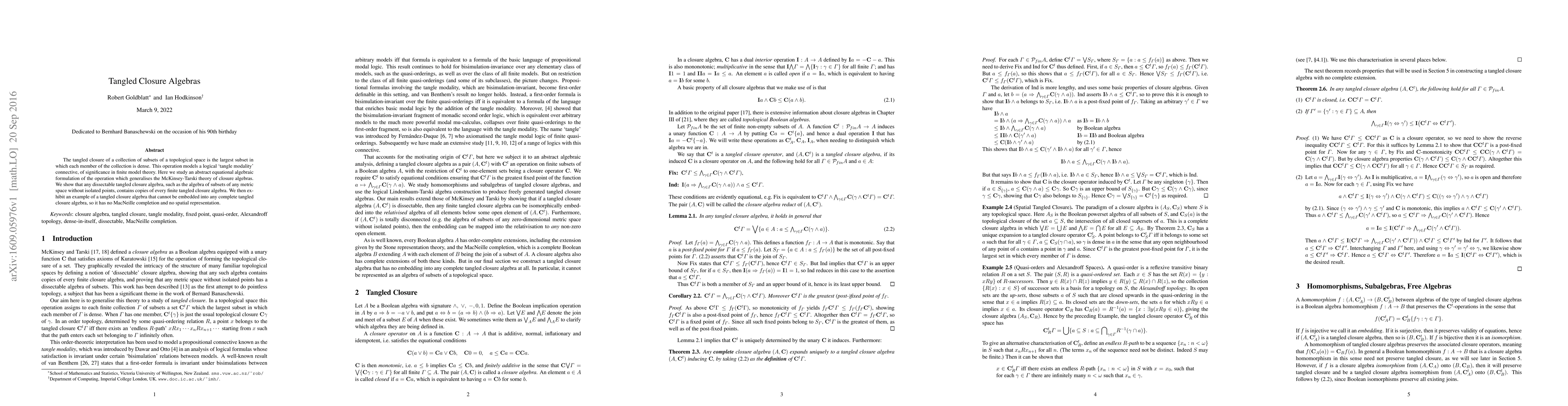 The tangled closure of a collection of subsets of a topological space is the largest subset in which each member of the collection is dense. This operation models a logical `tangle modality' connective, of significance in finite model theory. Here we study an abstract equational algebraic formulation of the operation which generalises the McKinsey-Tarski theory of closure algebras. We show that any dissectable tangled closure algebra, such as the algebra of subsets of any metric space without isolated points, contains copies of every finite tangled closure algebra. We then exhibit an example of a tangled closure algebra that cannot be embedded into any complete tangled closure algebra, so it has no MacNeille completion and no spatial representation.