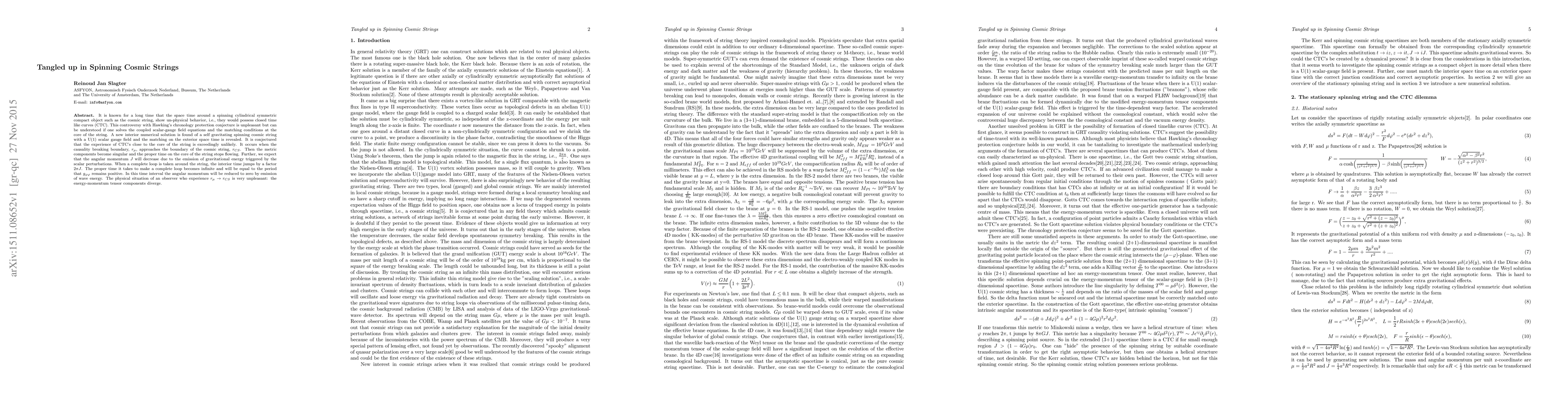 It is known for a long time that the space time around a spinning cylindrical symmetric compact object such as the cosmic string, show un-physical behavior, i.e., they would possess closed time like curves (CTC). This controversy with Hawking's chronology protection conjecture is unpleasant but can be understood if one solves the coupled scalar-gauge field equations and the matching conditions at the core of the string. A new interior numerical solution is found of a self gravitating spinning cosmic string with a U(1) scalar gauge field and the matching on the exterior space time is revealed. It is conjectured that the experience of CTC's close to the core of the string is exceedingly unlikely. It occurs when the causality breaking boundary, $r_\mu$, approaches the boundary of the cosmic string, $r_{CS}$. Then the metric components become singular and the proper time on the core of the string stops flowing. Further, we expect that the angular momentum $J$ will decrease due to the emission of gravitational energy triggered by the scalar perturbations. When a complete loop is taken around the string, the interior time jumps by a factor $2\pi J$. The proper time it takes to make a complete loop becomes infinite and will be equal to the period that $g_{\varphi\varphi}$ remains positive. In this time interval the angular momentum will be reduced to zero by emission of wave energy. The physical situation of an observer who experience $r_{\mu}\rightarrow r_{CS}$ is very unpleasant: the energy-momentum tensor components diverge.