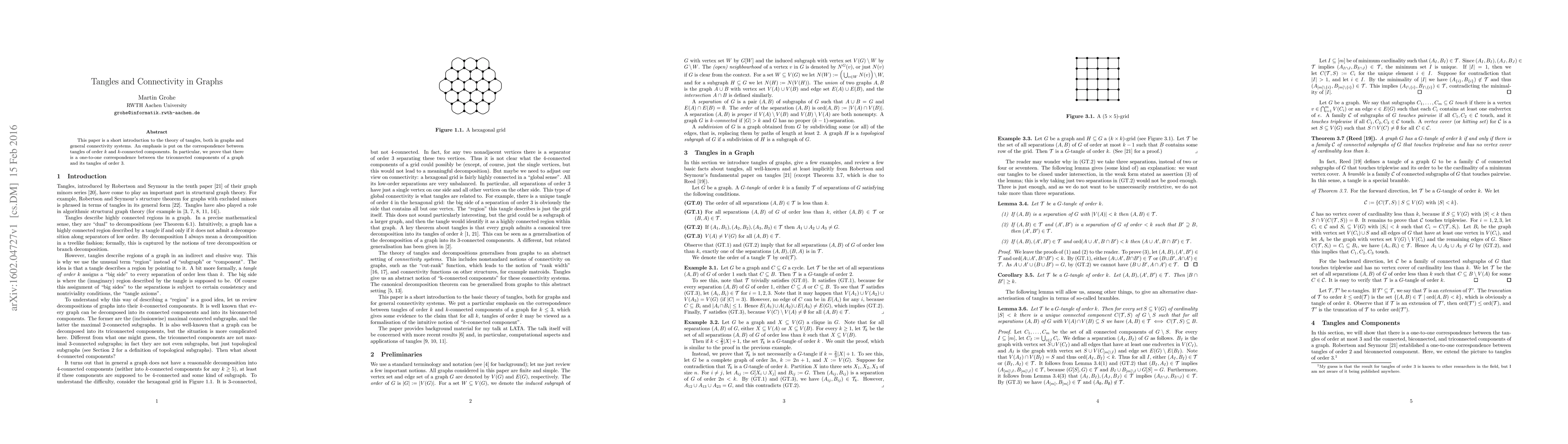 This paper introduces the theory of tangles in graphs and shows a one-to-one correspondence between triconnected components and their specific type of tangle called order 3.