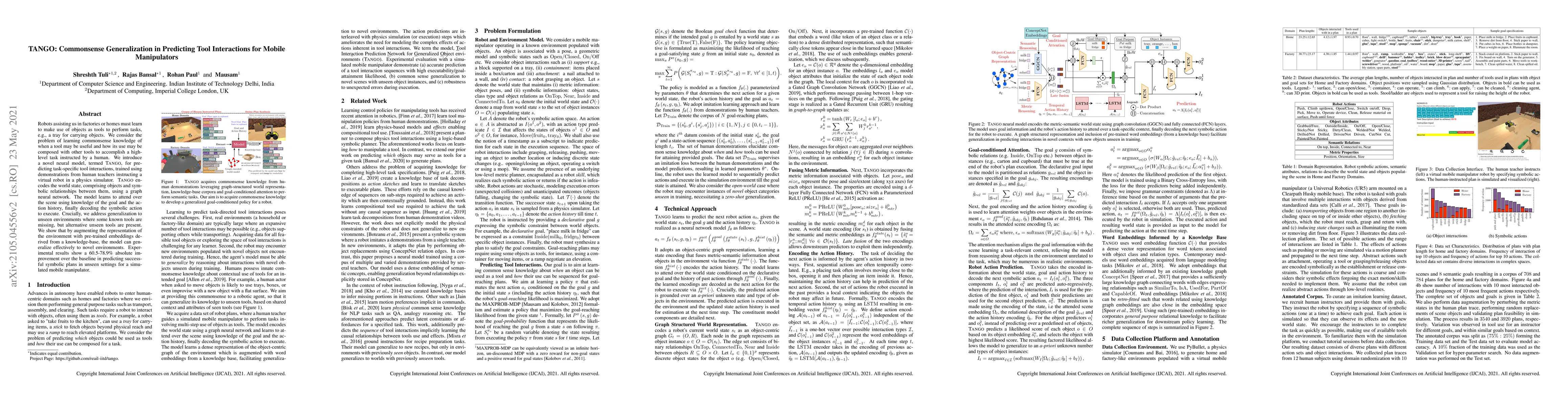 TANGO is a novel neural model designed to predict tool interactions for mobile manipulators by learning commonsense knowledge through human-guided demonstrations. It enhances generalization to unseen environments using pre-trained embeddings from a knowledge base, achieving significant improvements over baselines in task success prediction.