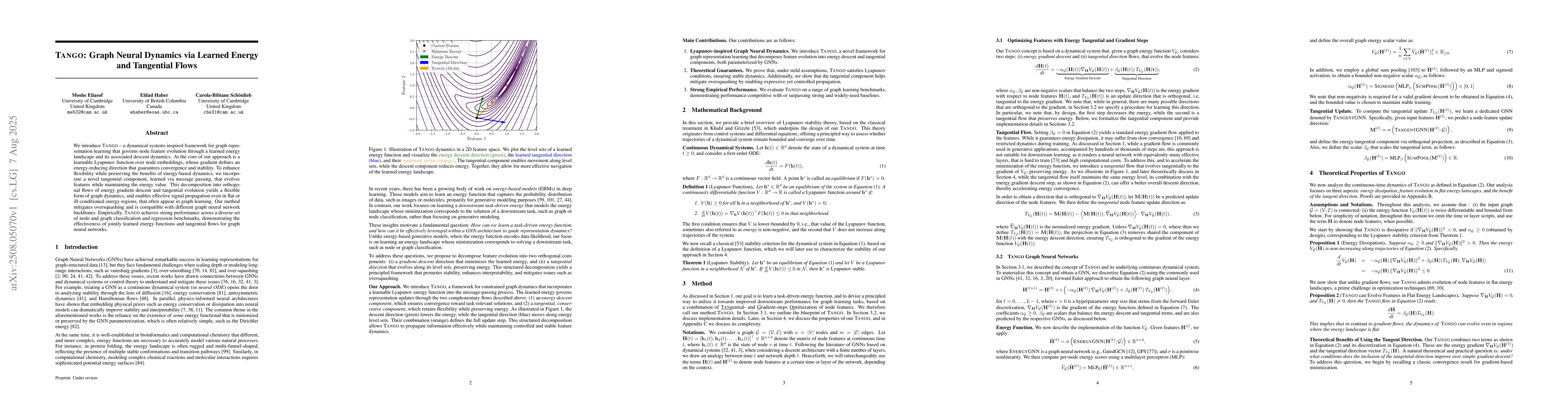 We introduce TANGO -- a dynamical systems inspired framework for graph representation learning that governs node feature evolution through a learned energy landscape and its associated descent dynamics. At the core of our approach is a learnable Lyapunov function over node embeddings, whose gradient defines an energy-reducing direction that guarantees convergence and stability. To enhance flexibility while preserving the benefits of energy-based dynamics, we incorporate a novel tangential component, learned via message passing, that evolves features while maintaining the energy value. This decomposition into orthogonal flows of energy gradient descent and tangential evolution yields a flexible form of graph dynamics, and enables effective signal propagation even in flat or ill-conditioned energy regions, that often appear in graph learning. Our method mitigates oversquashing and is compatible with different graph neural network backbones. Empirically, TANGO achieves strong performance across a diverse set of node and graph classification and regression benchmarks, demonstrating the effectiveness of jointly learned energy functions and tangential flows for graph neural networks.