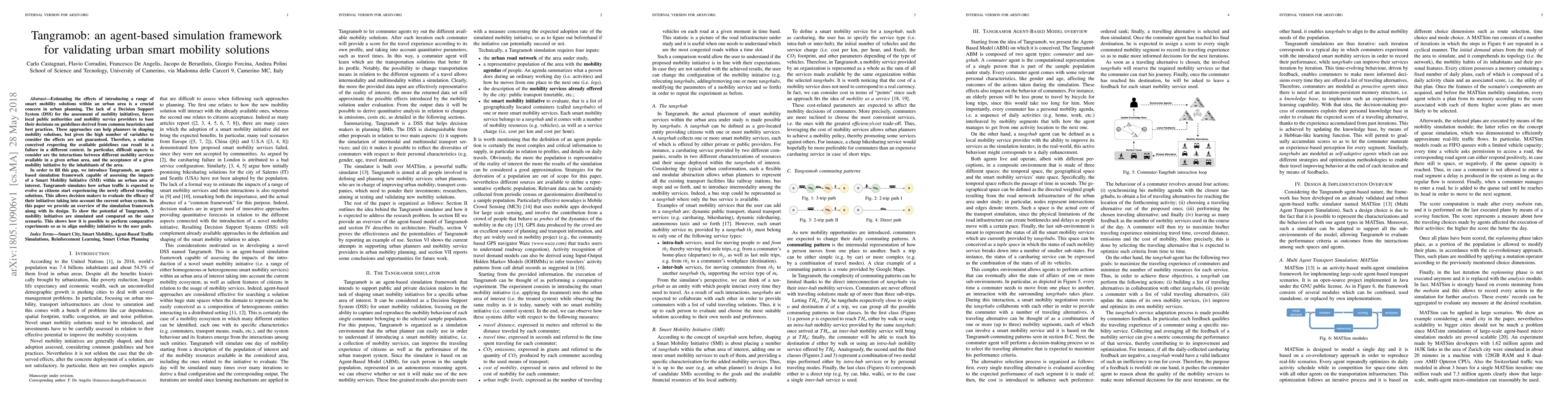 Tangramob is an agent-based simulation framework designed to evaluate the impacts of smart mobility solutions in urban areas by simulating interactions between different mobility services and assessing their acceptance by inhabitants. This tool helps decision-makers align their initiatives with urban dynamics and user goals through comparative experiments.