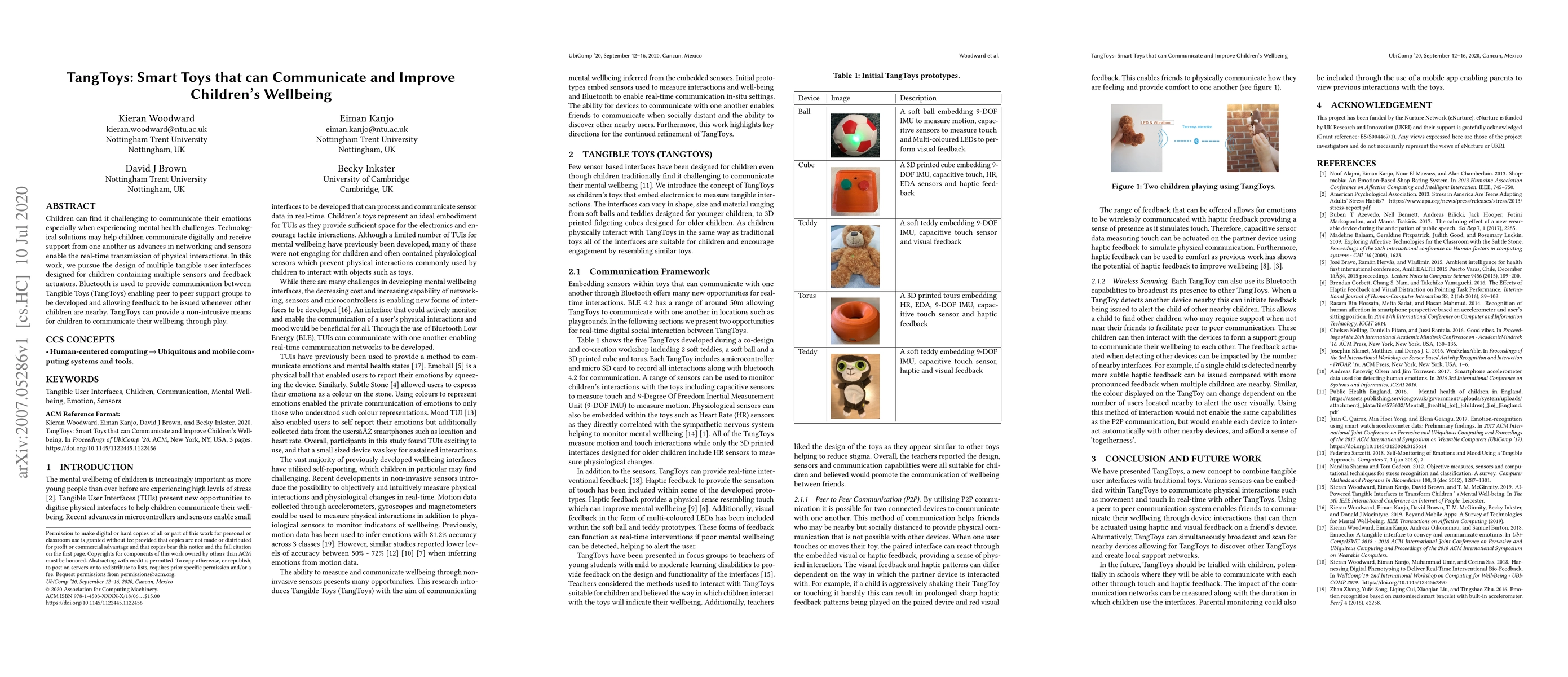 Children can find it challenging to communicate their emotions especially when experiencing mental health challenges. Technological solutions may help children communicate digitally and receive support from one another as advances in networking and sensors enable the real-time transmission of physical interactions. In this work, we pursue the design of multiple tangible user interfaces designed for children containing multiple sensors and feedback actuators. Bluetooth is used to provide communication between Tangible Toys (TangToys) enabling peer to peer support groups to be developed and allowing feedback to be issued whenever other children are nearby. TangToys can provide a non-intrusive means for children to communicate their wellbeing through play.