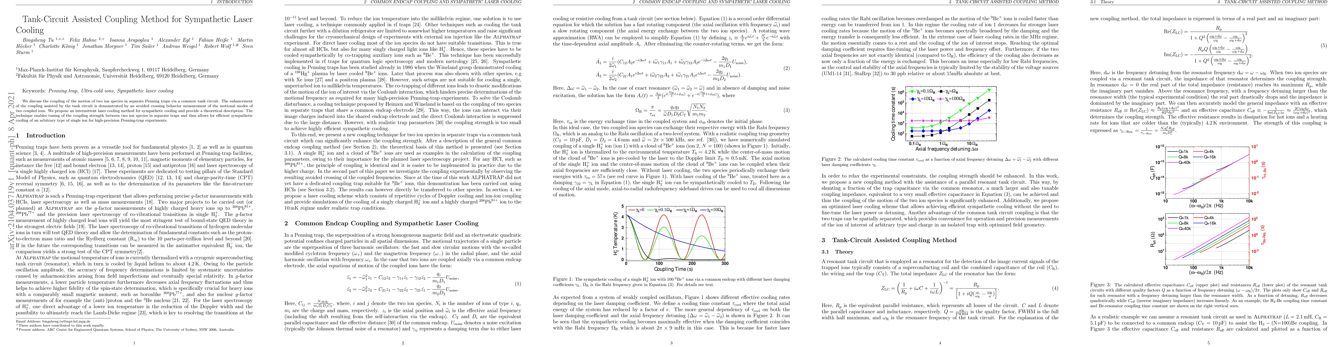 This paper proposes a tank-circuit assisted coupling method for sympathetic laser cooling of ions in separate Penning traps, utilizing an avoided crossing behavior to enhance coupling. The technique allows for efficient sympathetic cooling and tunable coupling strength for high-precision experiments.