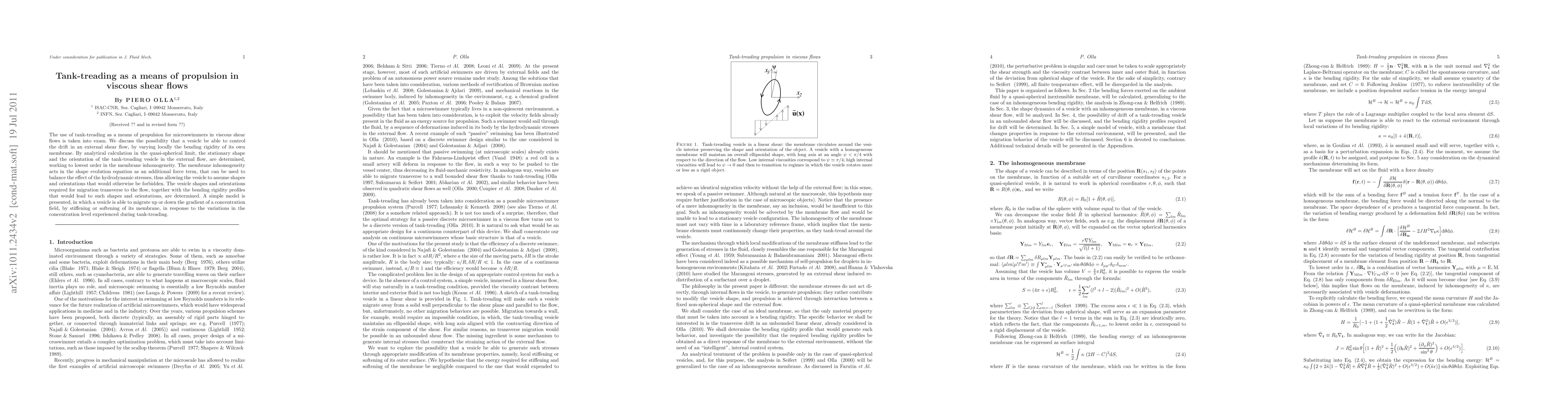 This paper explores tank-treading as a propulsion mechanism for microswimmers in viscous shear flows, demonstrating how vesicles can control drift by adjusting membrane bending rigidity. The study analytically determines the vesicle's shape and orientation, showing how inhomogeneity in membrane rigidity allows for migration across the flow.