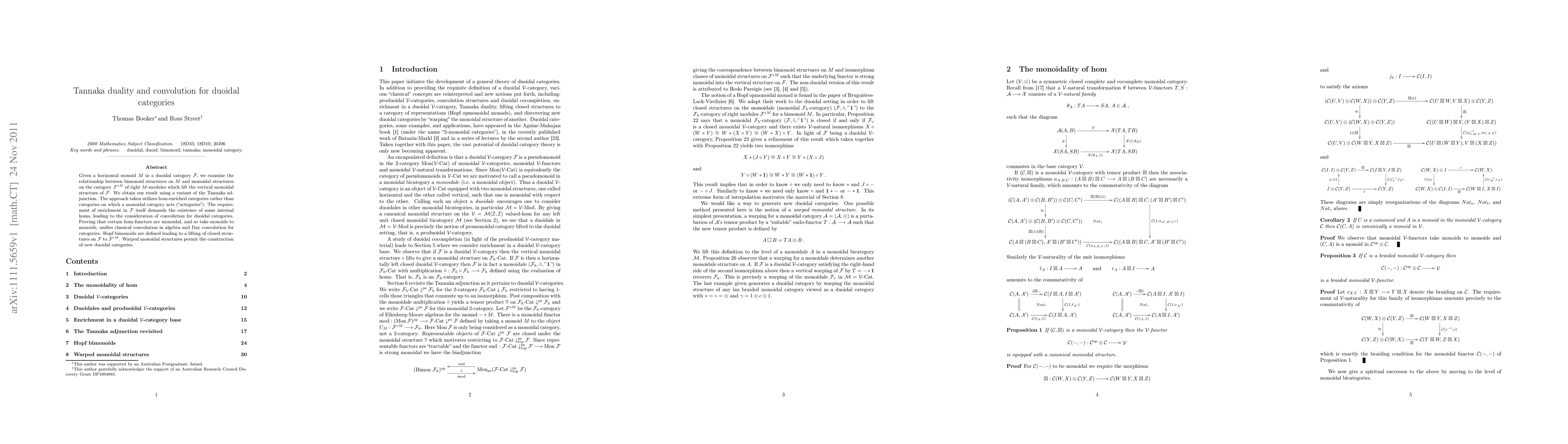 This paper explores the connection between bimonoid structures on a horizontal monoid within a duoidal category and monoidal structures on its module category via Tannaka duality. It leverages hom-enriched categories and convolution techniques to unify classical and Day convolution, defining Hopf bimonoids and constructing new duoidal categories.