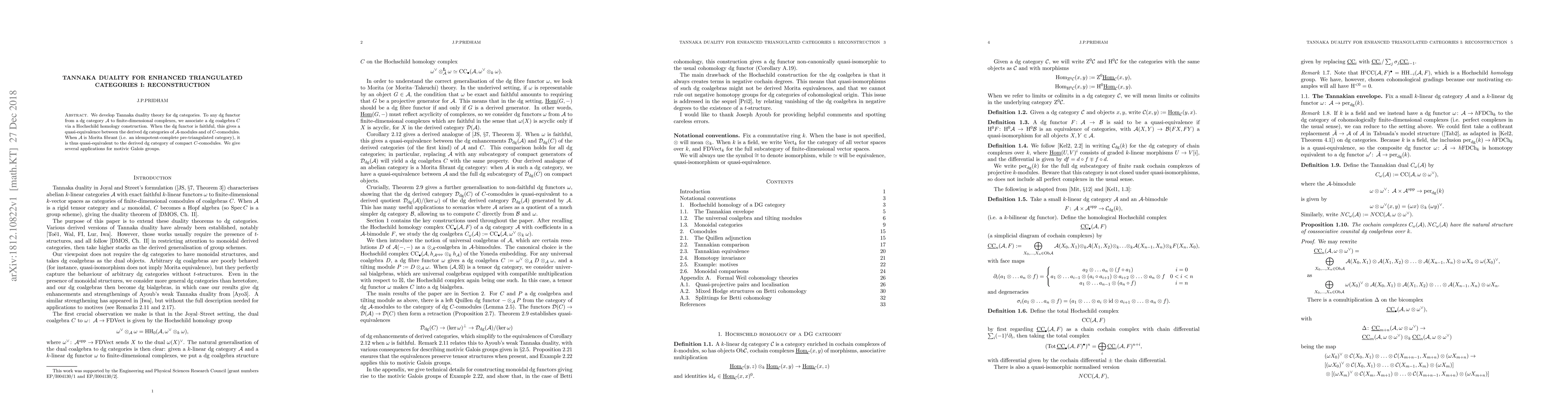 This paper develops Tannaka duality for dg categories, constructing a dg coalgebra from a dg functor, and shows that under certain conditions, the derived dg category of $\mathcal{A}$-modules is quasi-equivalent to the derived dg category of compact $C$-comodules. The applications include insights into motivic Galois groups.