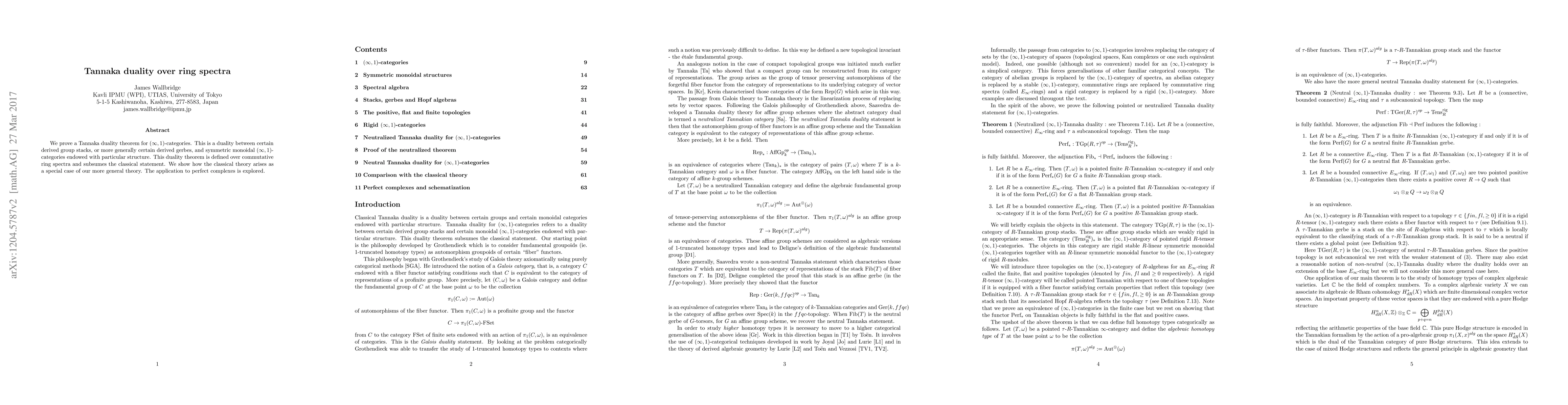 Summary: The paper establishes a Tannaka duality theorem for $(\infty,1)$-categories, linking derived group stacks to symmetric monoidal $(\infty,1)$-categories over commutative ring spectra, subsuming classical theory and exploring applications to perfect complexes.