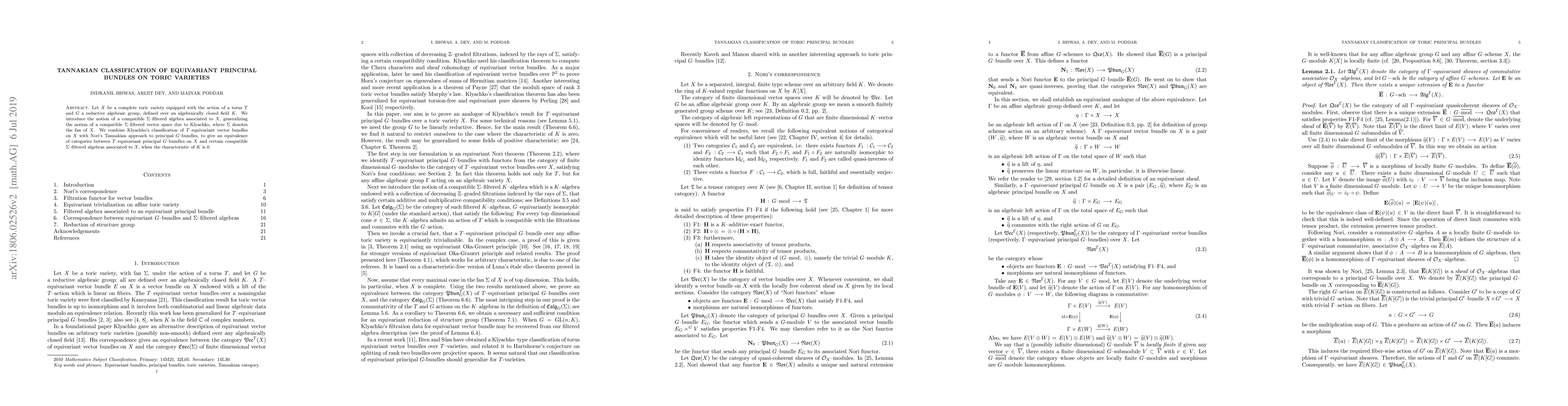 This paper explores the Tannakian classification of $T$-equivariant principal $G$-bundles on complete toric varieties $X$ by associating them with compatible $\Sigma$-filtered algebras, extending Klyachko's classification of $T$-equivariant vector bundles and using Nori's Tannakian approach when the field characteristic is zero.