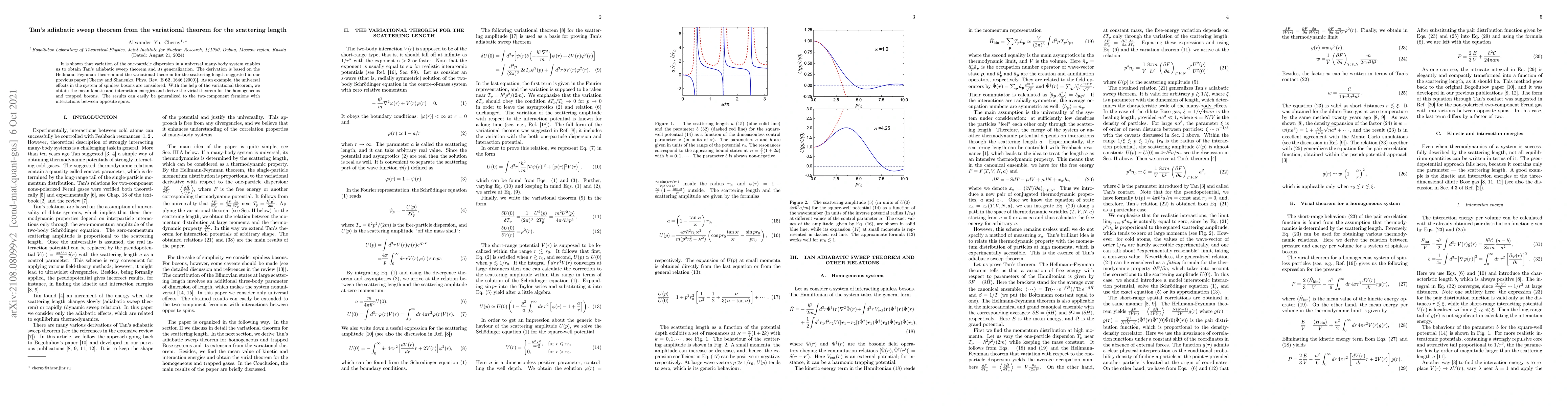 It is shown that variation of the one-particle dispersion in a universal many-body system enables us to obtain Tan's adiabatic sweep theorem and its generalization. The derivation is based on the Hellmann-Feynman theorem and the variational theorem for the scattering length suggested in our previous paper [Cherny and Shanenko, Phys. Rev. E 62, 1646 (2000)]. As an example, the universal effects in the system of spinless bosons are considered. With the help of the variational theorem, we obtain the mean kinetic and interaction energies and derive the virial theorem for the homogeneous and trapped bosons. The results can easily be generalized to the two-component fermions with interactions between opposite spins.