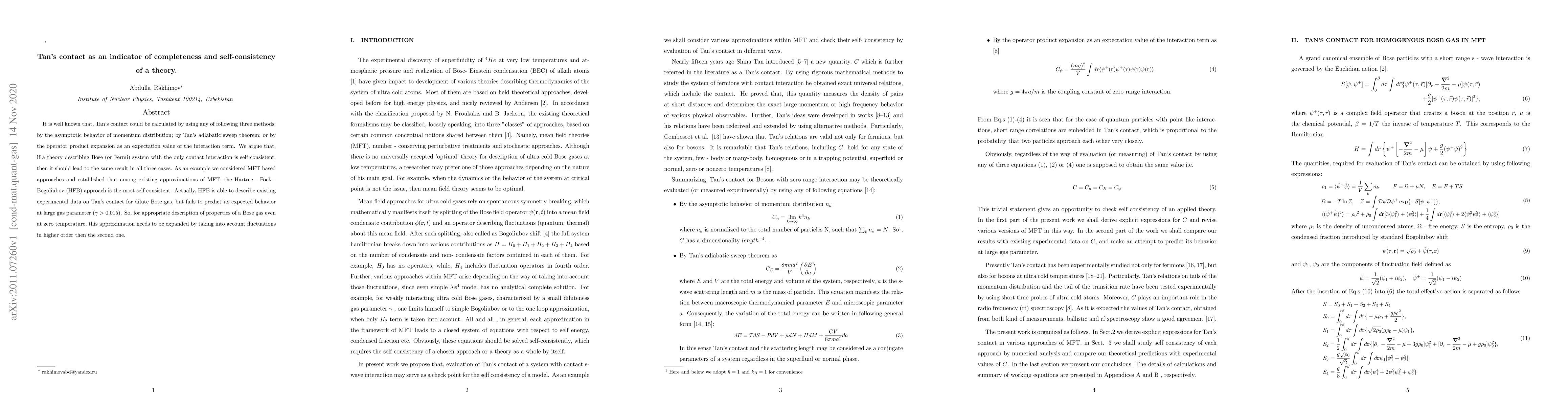 A theory describing a Bose (or Fermi) system with only contact interaction should yield consistent results using three different methods, according to the paper. However, existing approximations like Hartree-Fock-Bogoliubov fail to predict Tan's contact at large gas parameters.