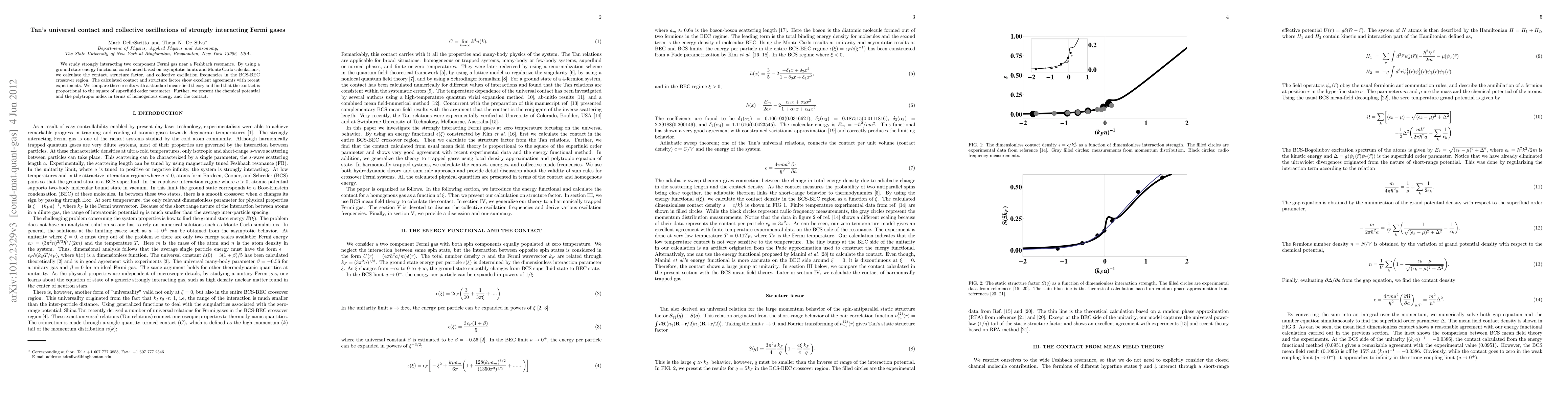 This research paper studies strongly interacting Fermi gases near a Feshbach resonance, calculating contact, structure factor, and collective oscillation frequencies with excellent agreement with experiments. The results show the contact is proportional to the square of superfluid order parameter.