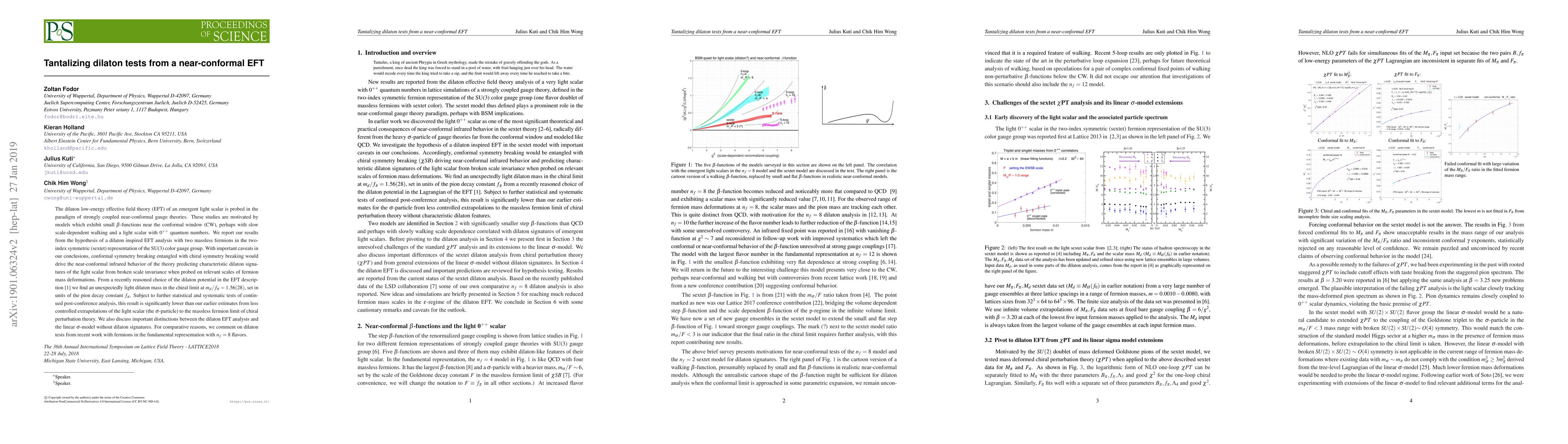 The dilaton low-energy effective field theory (EFT) of an emergent light scalar is probed in the paradigm of strongly coupled near-conformal gauge theories. These studies are motivated by models which exhibit small $\beta$-functions near the conformal window (CW), perhaps with slow scale-dependent walking and a light scalar with ${ 0^{++} }$ quantum numbers. We report our results from the hypothesis of a dilaton inspired EFT analysis with two massless fermions in the two-index symmetric (sextet) representation of the SU(3) color gauge group. With important caveats in our conclusions, conformal symmetry breaking entangled with chiral symmetry breaking would drive the near-conformal infrared behavior of the theory predicting characteristic dilaton signatures of the light scalar from broken scale invariance when probed on relevant scales of fermion mass deformations. From a recently reasoned choice of the dilaton potential in the EFT description~\cite{Golterman:2016lsd} we find an unexpectedly light dilaton mass in the chiral limit at $m_d/f_\pi = 1.56(28)$, set in units of the pion decay constant $f_\pi$. Subject to further statistical and systematic tests of continued post-conference analysis, this result is significantly lower than our earlier estimates from less controlled extrapolations of the light scalar (the $\sigma$-particle) to the massless fermion limit of chiral perturbation theory. We also discuss important distinctions between the dilaton EFT analysis and the linear $\sigma$-model without dilaton signatures. For comparative reasons, we comment on dilaton tests from recent work with fermions in the fundamental representation with $n_f=8$ flavors.